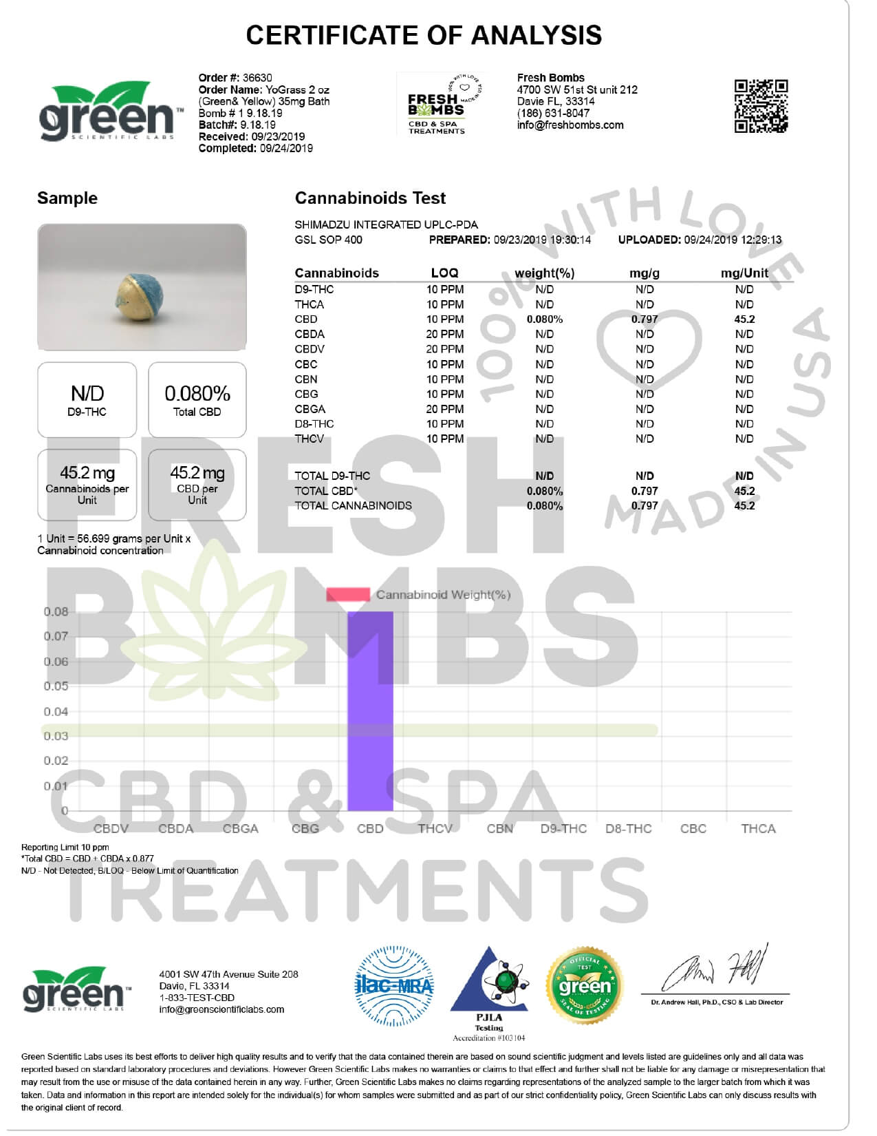 Fresh Bombs CBD Bath YoGrass Bath Bomb Lab Report
