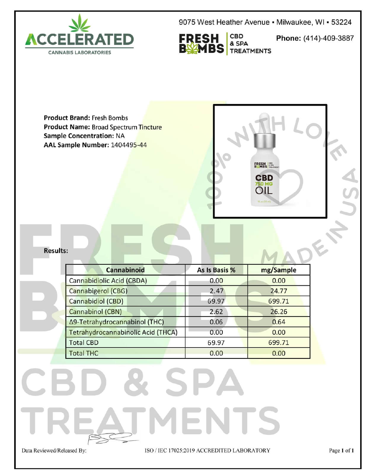 Fresh Bombs CBD Tincture Broad Spectrum Oil 750mg Lab Report