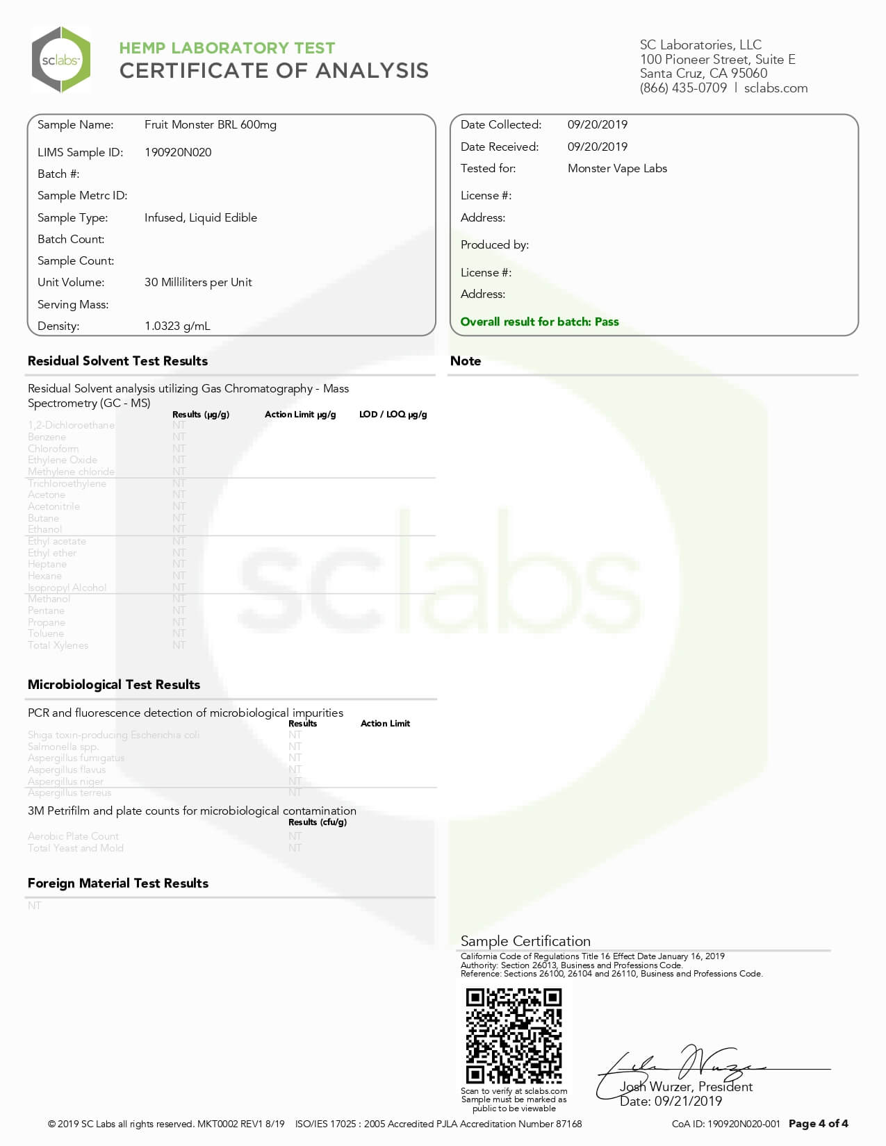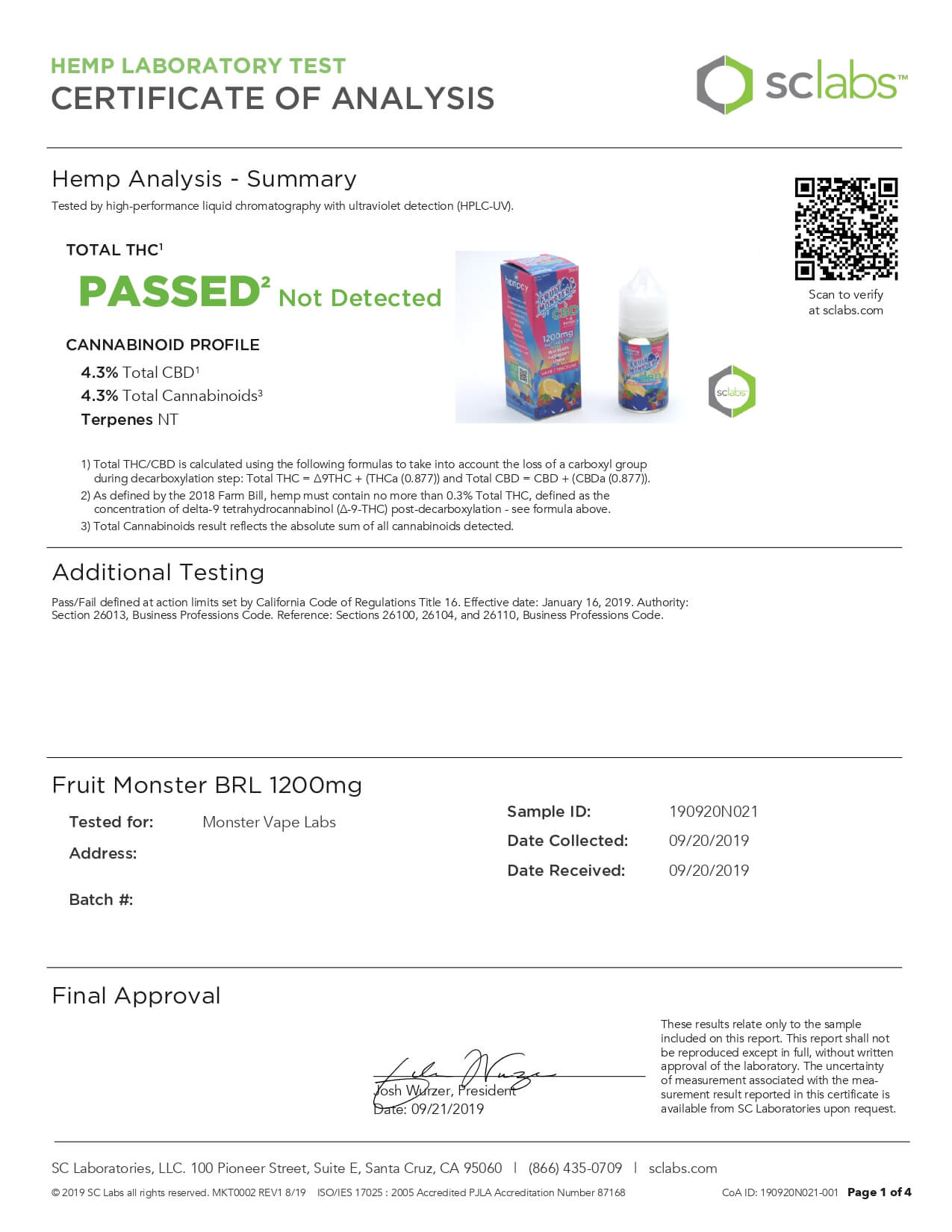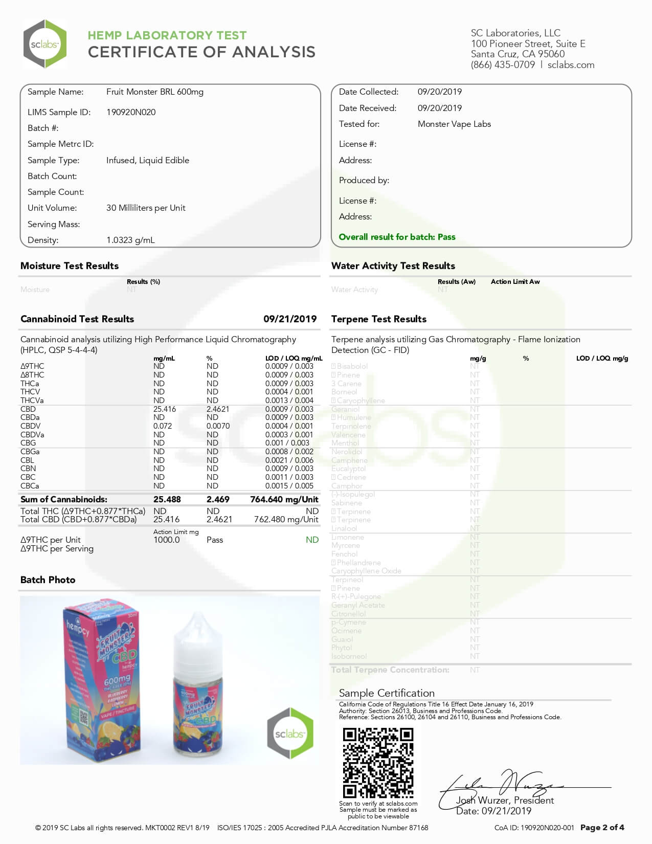 Fruit Monster CBD Vape Blueberry Raspberry Lemon Lab Report important details about vaping products.