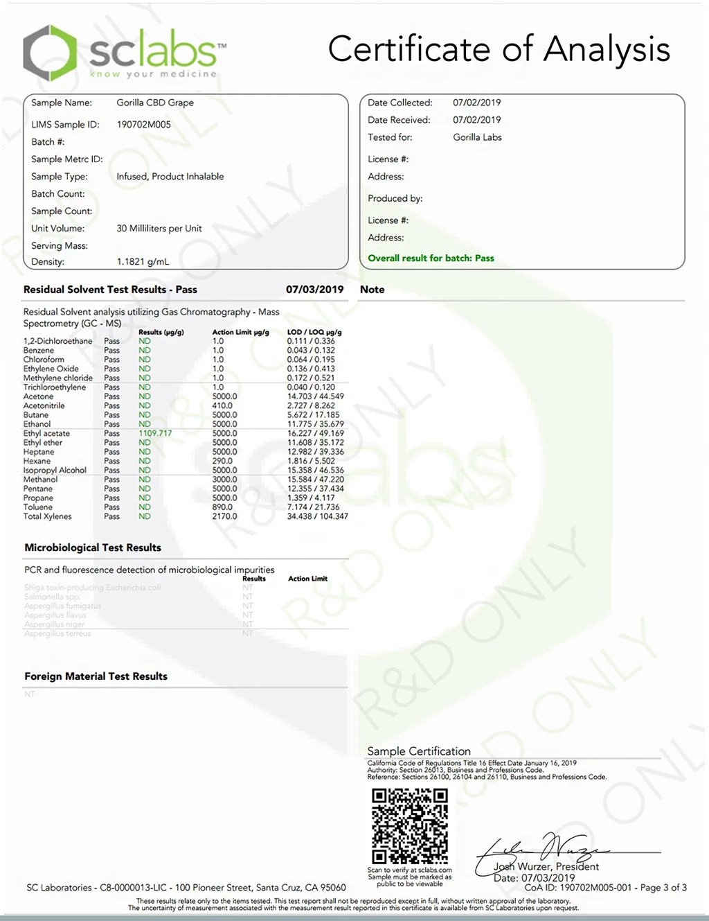Gorilla CBD Grape Vape Juice Lab Reports well defined details presented with reference to vaping products.