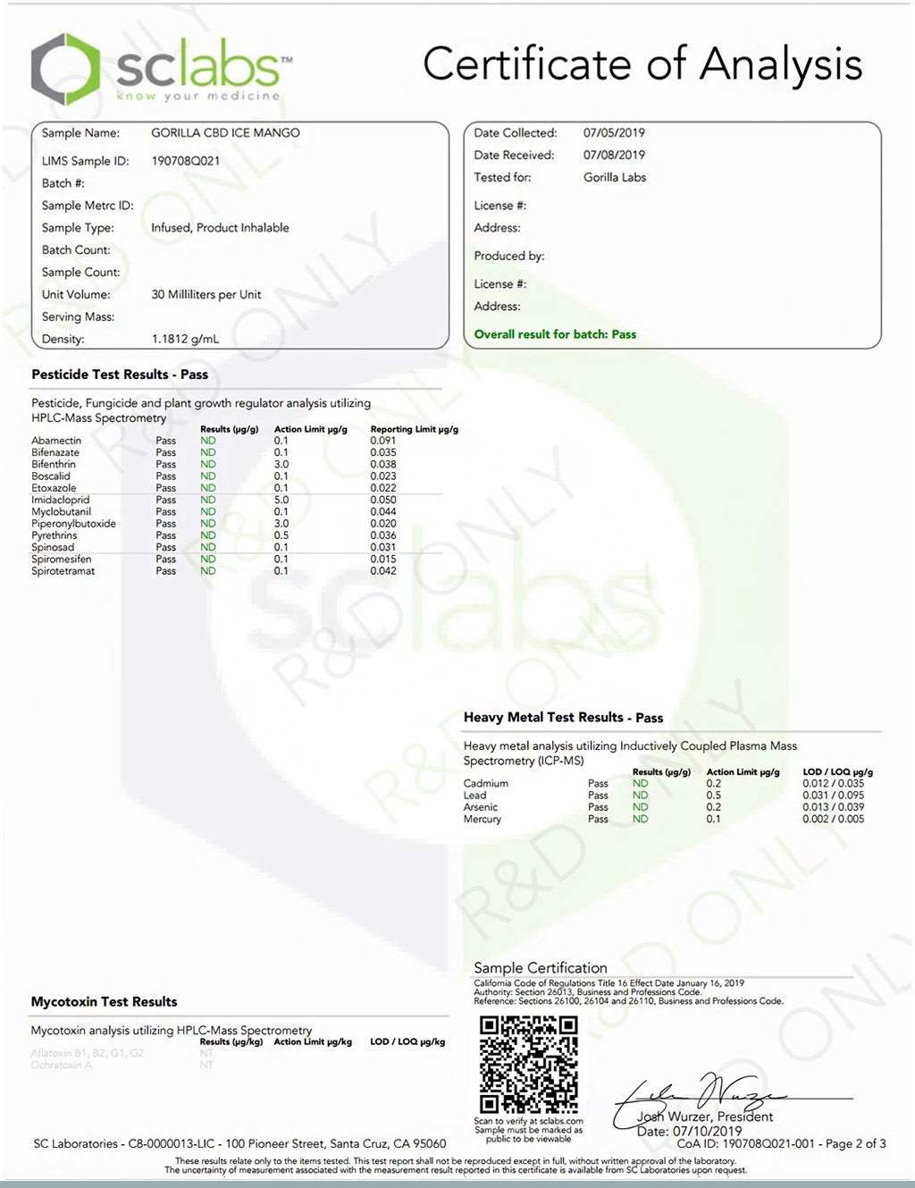 Gorilla CBD Ice Mango Vape Juice Lab Reports detailed facts presented to ensure accurate information to vapes products.
