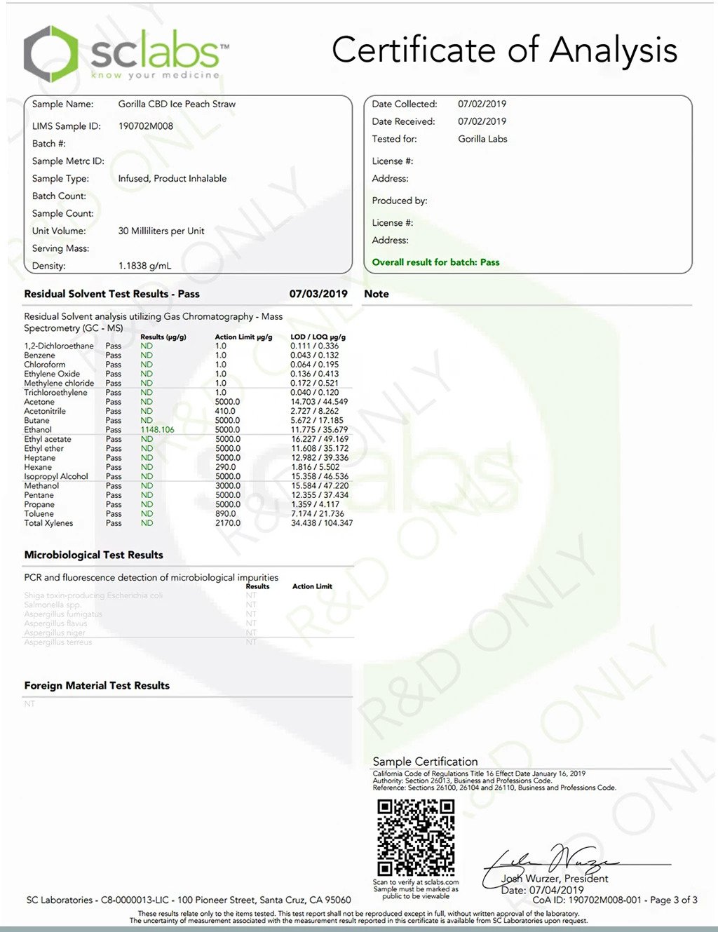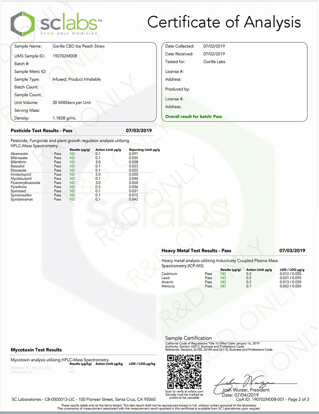 Gorilla CBD Ice Peach Straw Vape Juice Lab Report straight from the source educating your knowledge in regards to vapes products.
