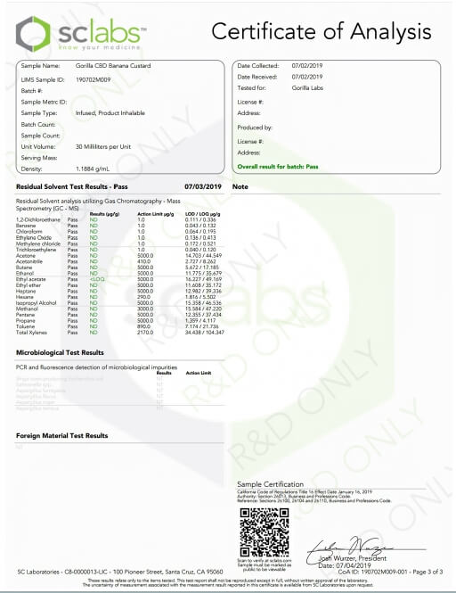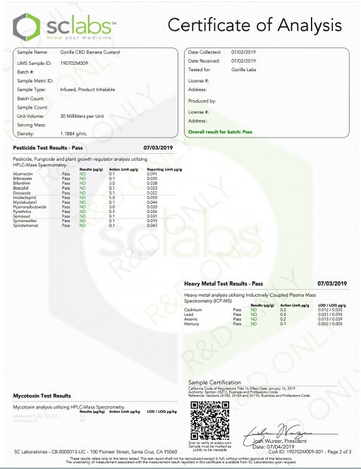 Gorilla CBD Vape Juice Banana Custard Lab Report important details about vaping products.
