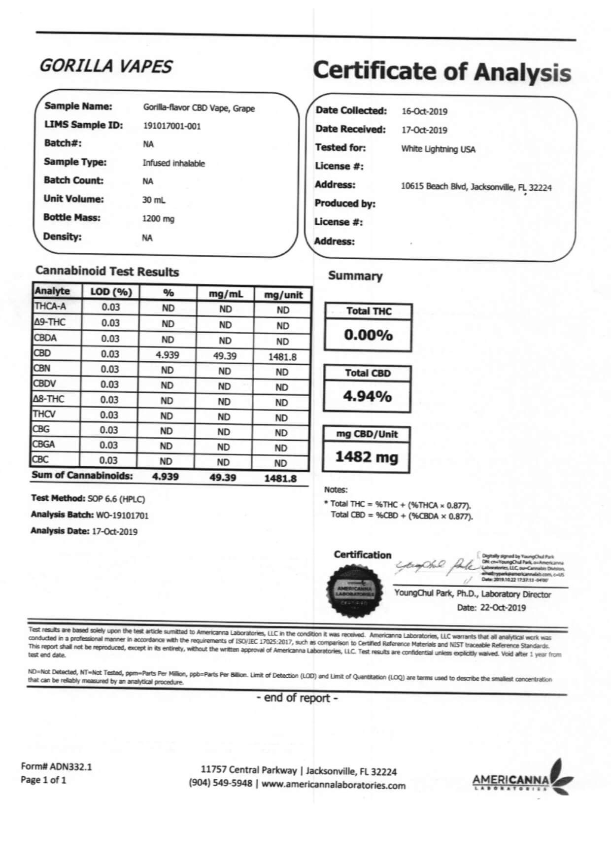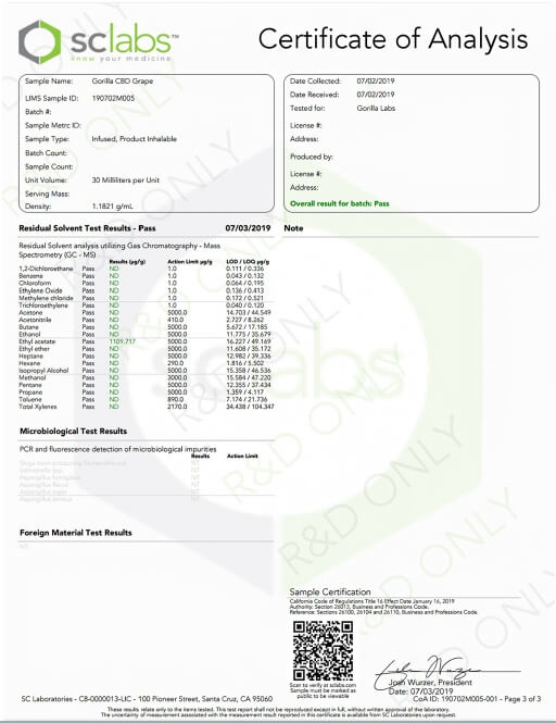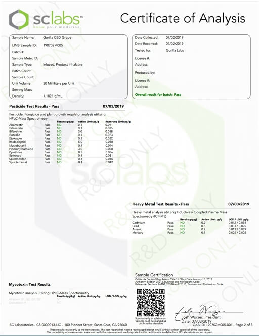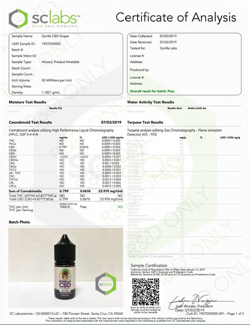 Gorilla CBD Vape Juice Grape Lab Report important details about vaping products.