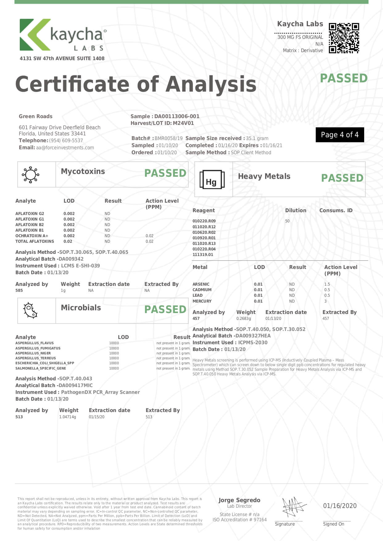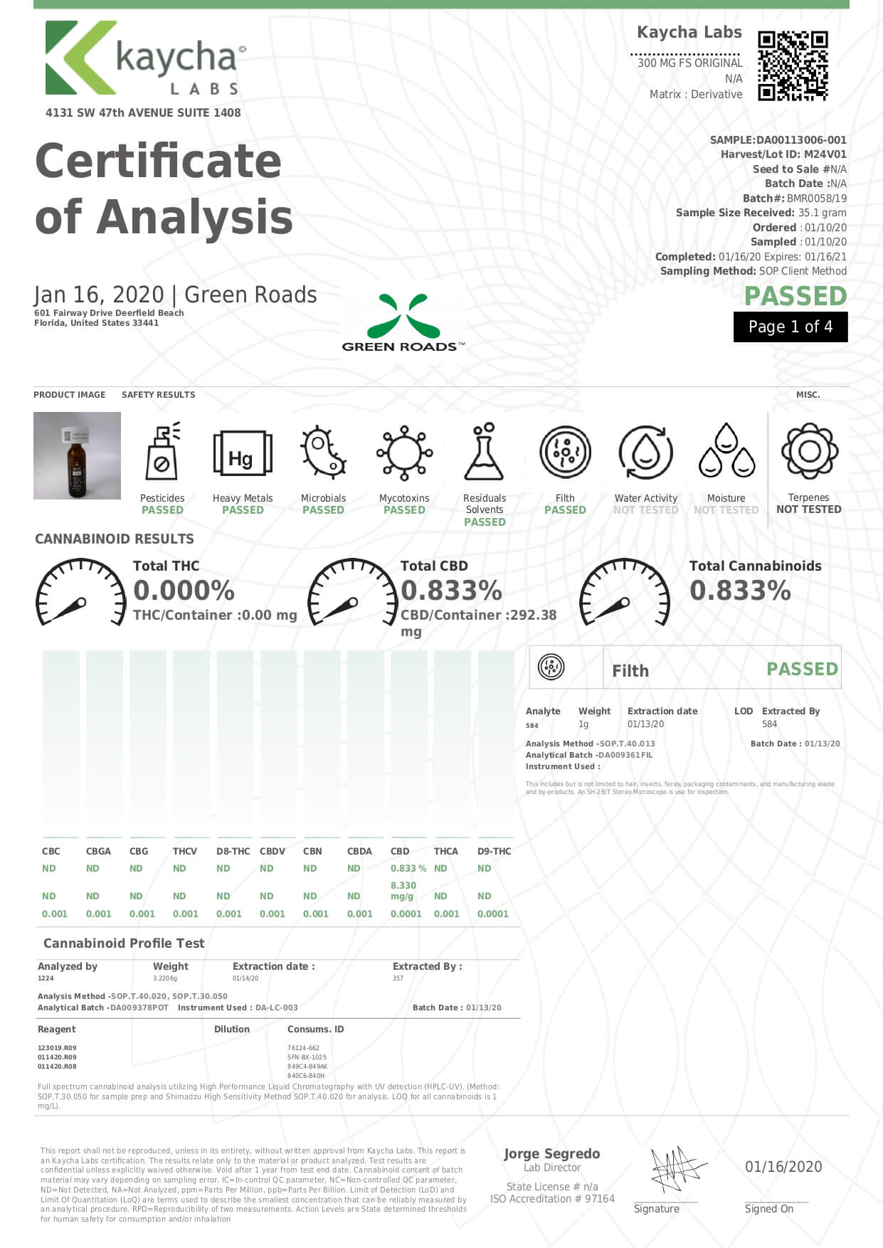 Green Roads CBD Tincture Full Spectrum Mild Lab Report