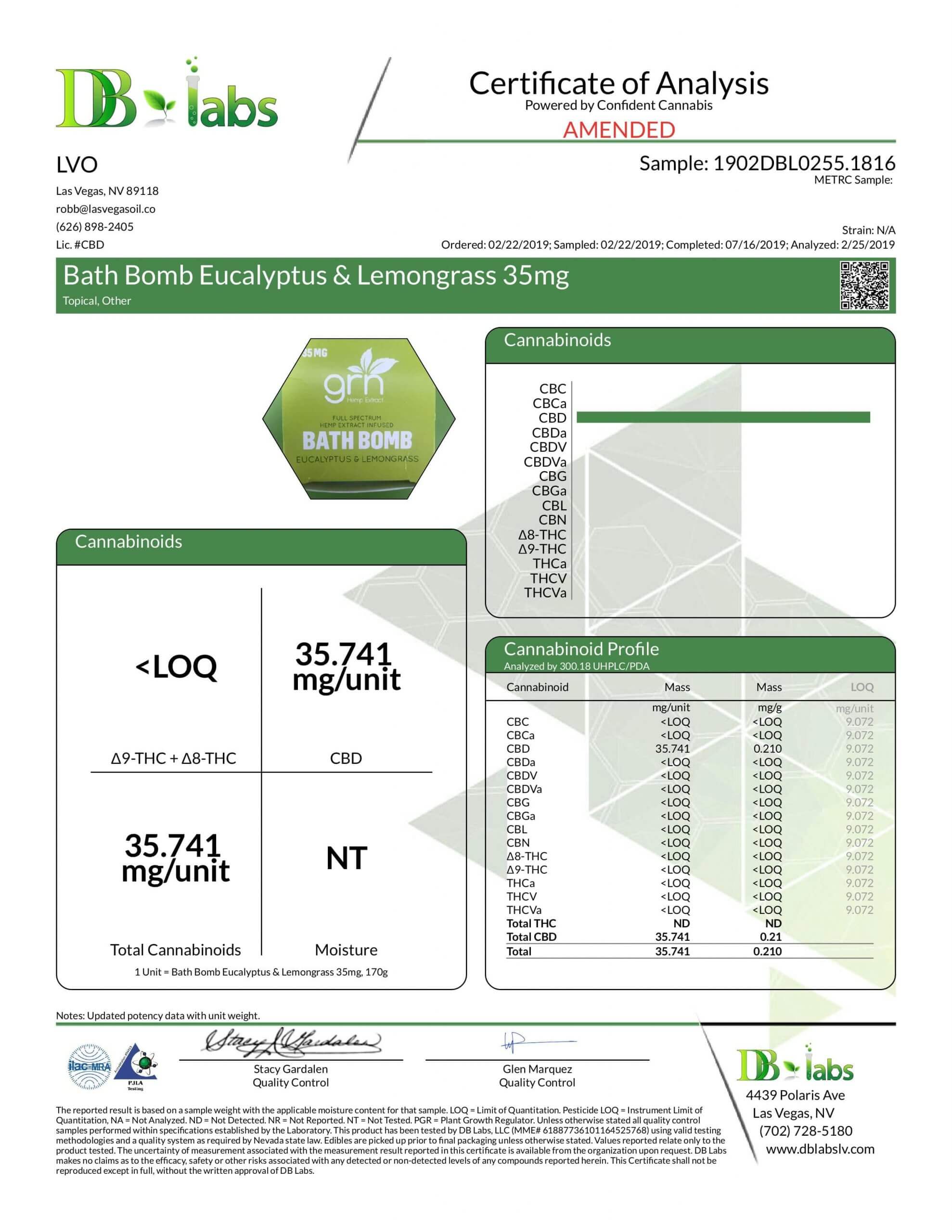 GRN CBD Bath Bomb Eucalyptus and Lemongrass Lab Reports test results with reference to CBD products.