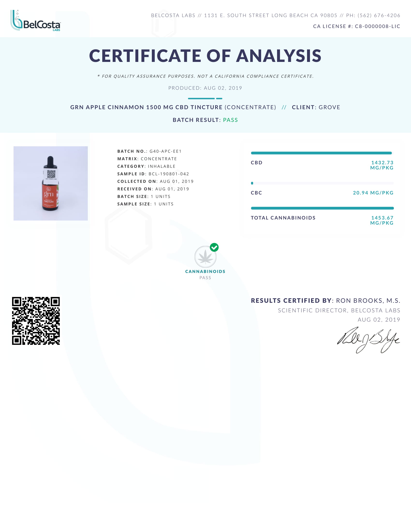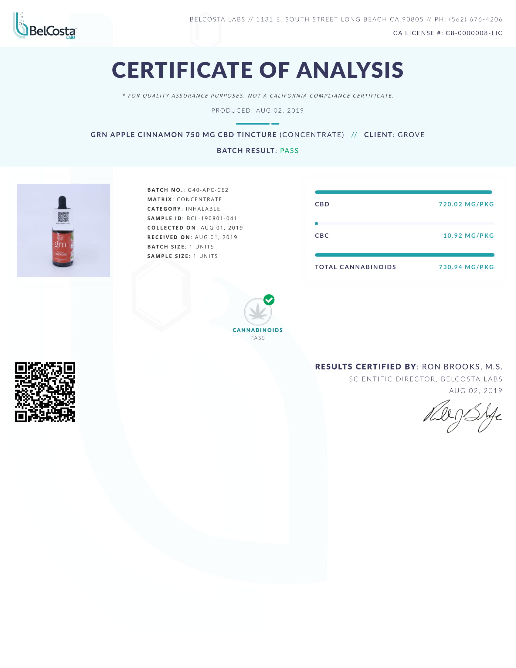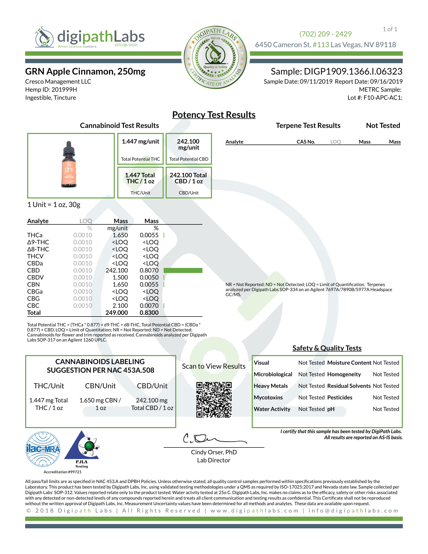 GRN CBD Oil Tincture Broad Spectrum Apple Cinnamon Lab Reports test results with reference to CBD products.