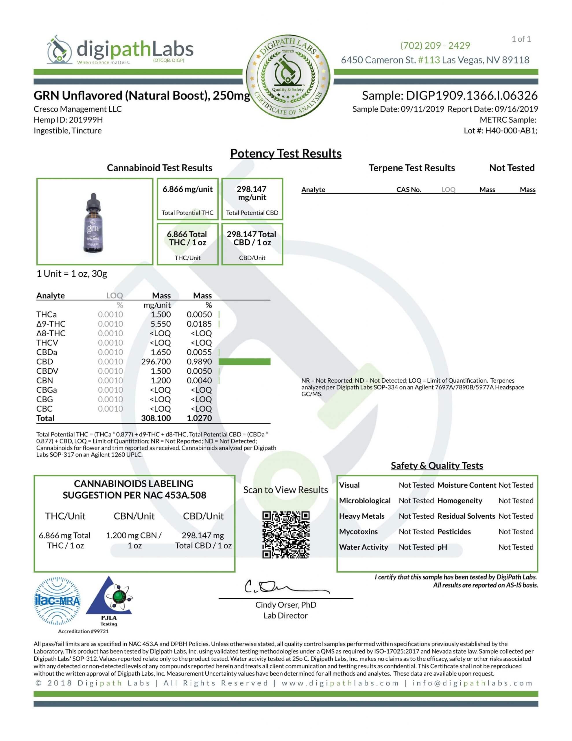 GRN CBD Oil Tincture Full Spectrum Unflavored Lab Reports test results with reference to CBD products.