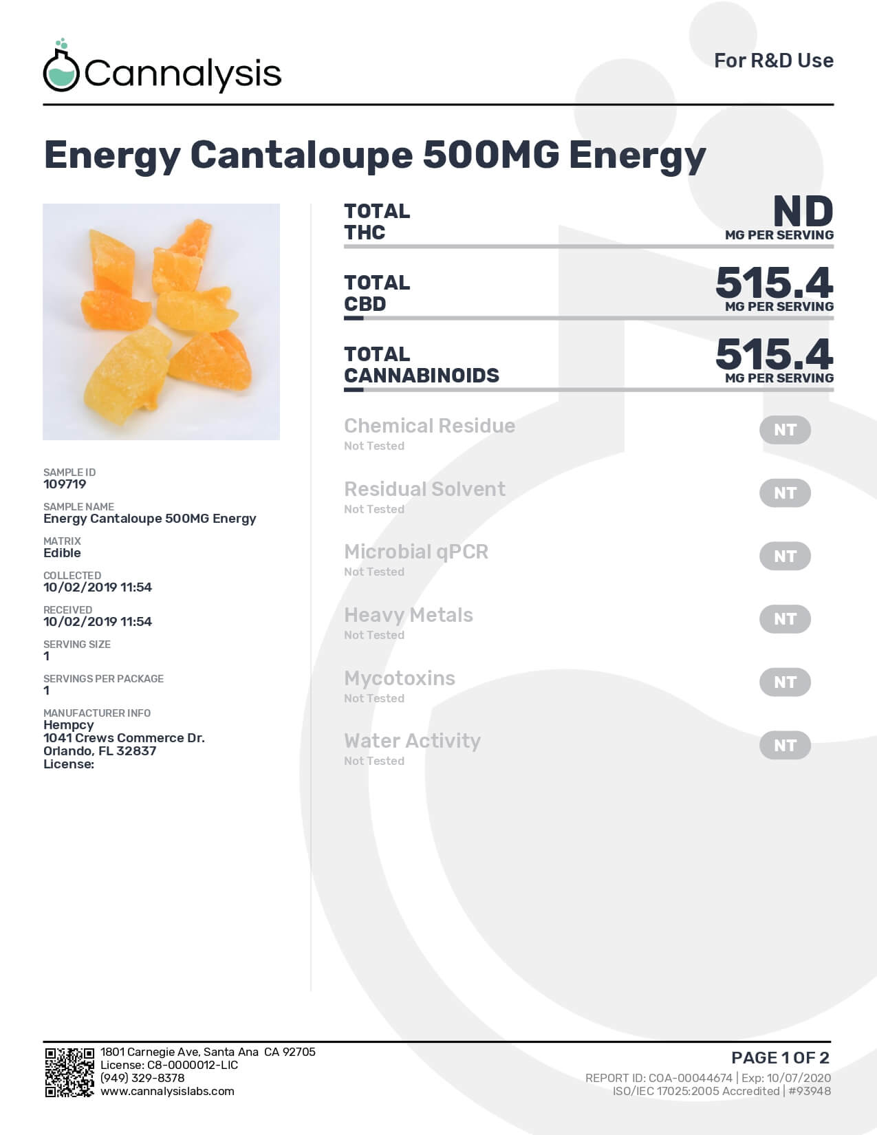 Hempcy CBD Edible Energy Cantaloupe Lab Report