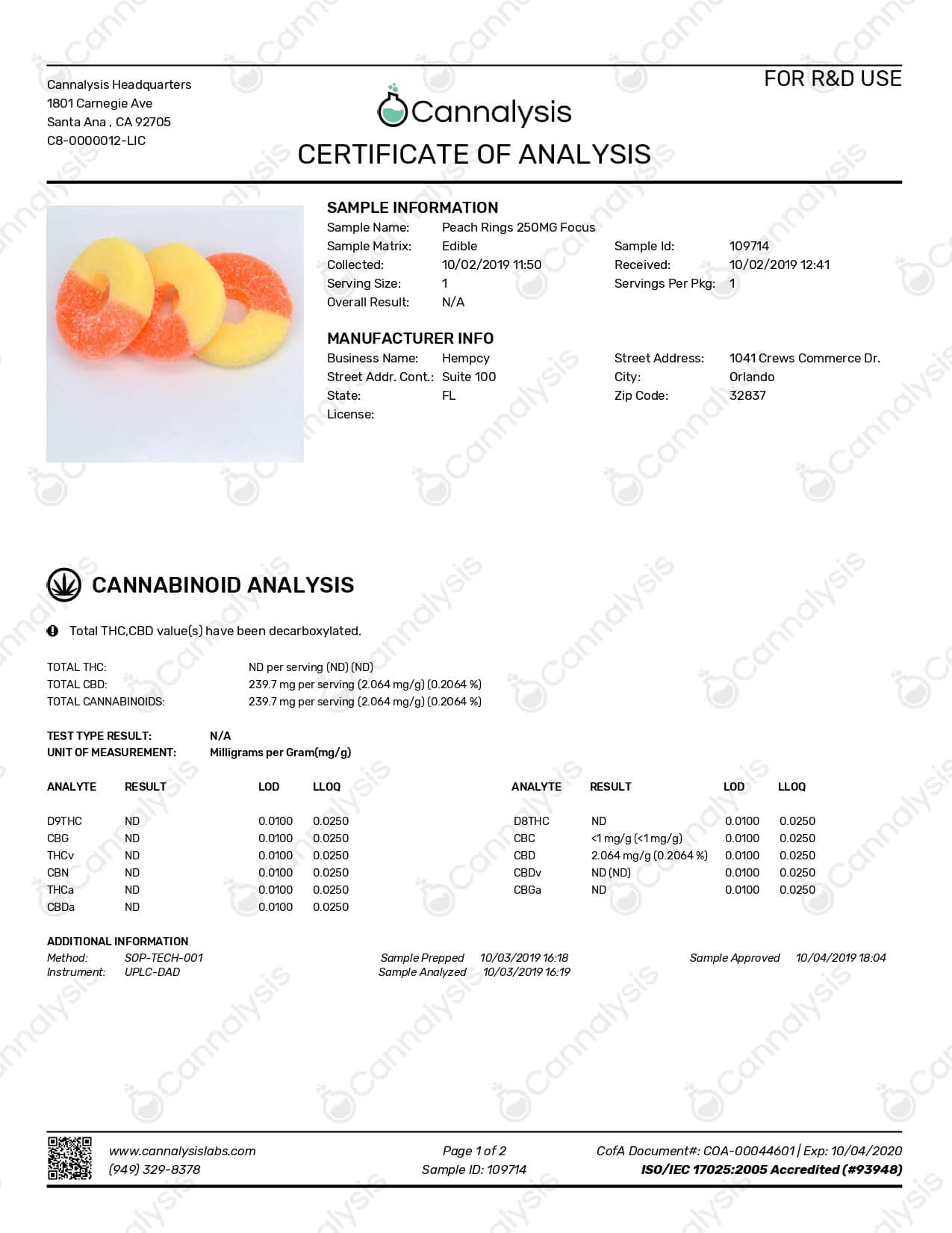 Hempcy CBD Edible Peach Ring Gummies Lab Report