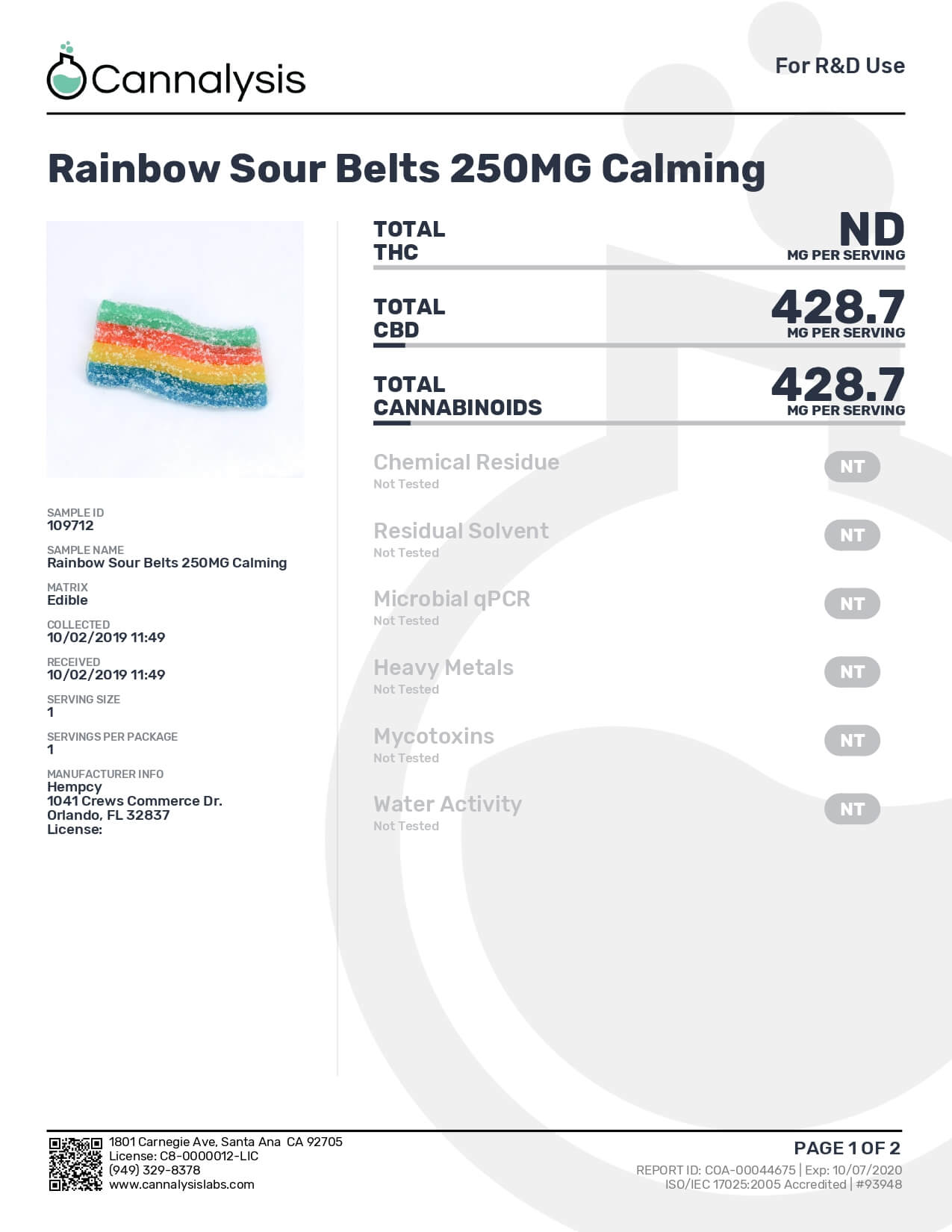 Hempcy CBD Edible Rainbow Sour Belt Gummies Lab Report