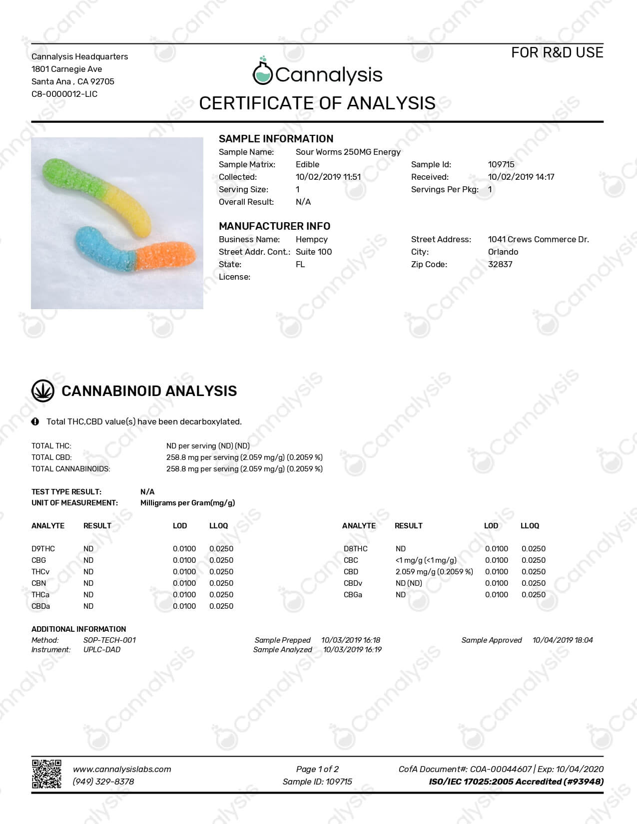 Hempcy CBD Edible Sour Worm Gummies Lab Report