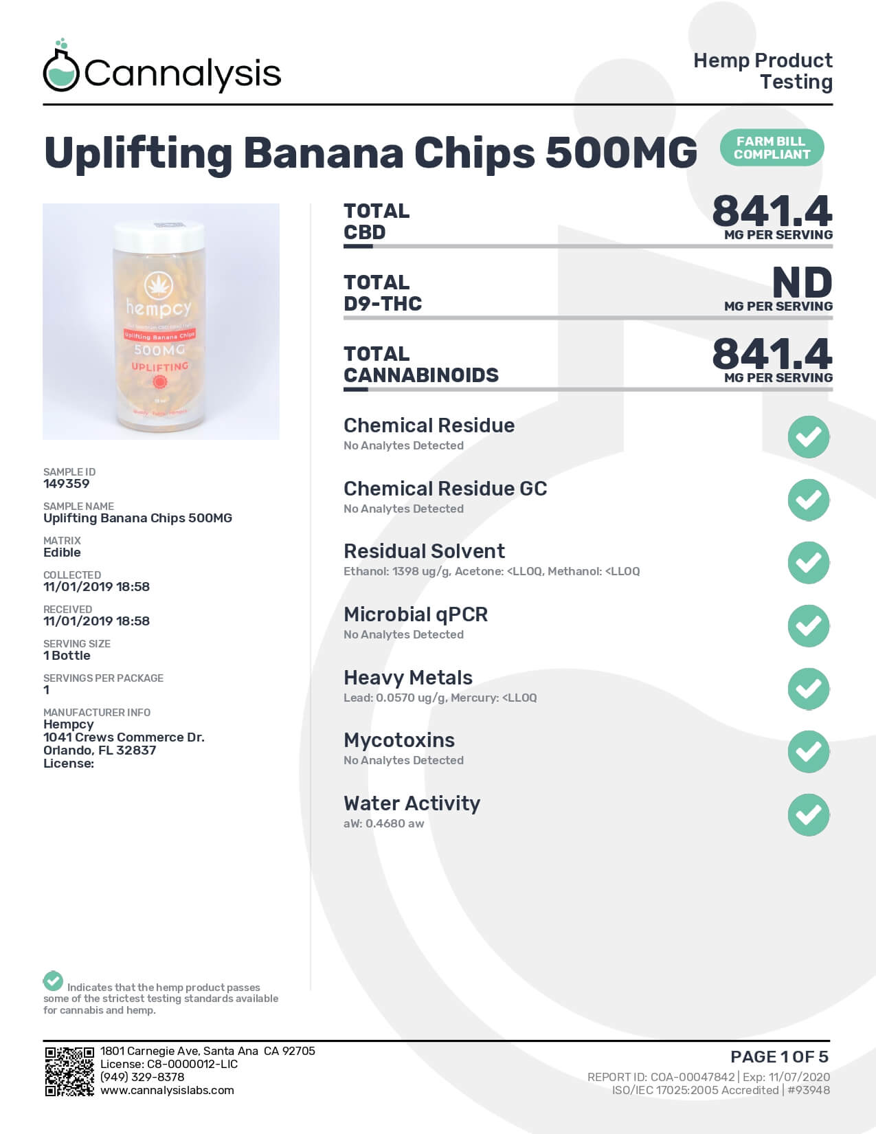 Hempcy CBD Edible Uplifting Banana Chips Lab Report