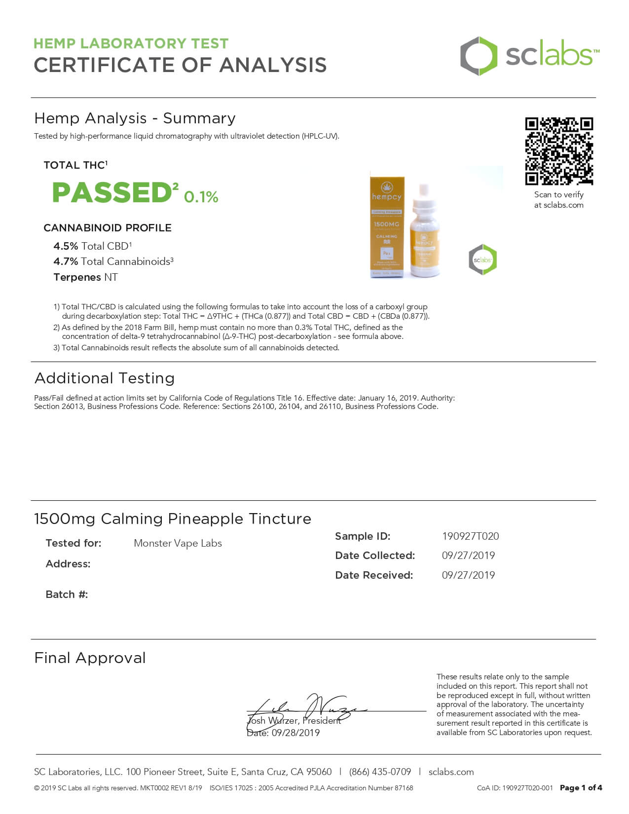 Hempcy CBD Tincture Calming Pineapple Lab Report important details about vaping products.