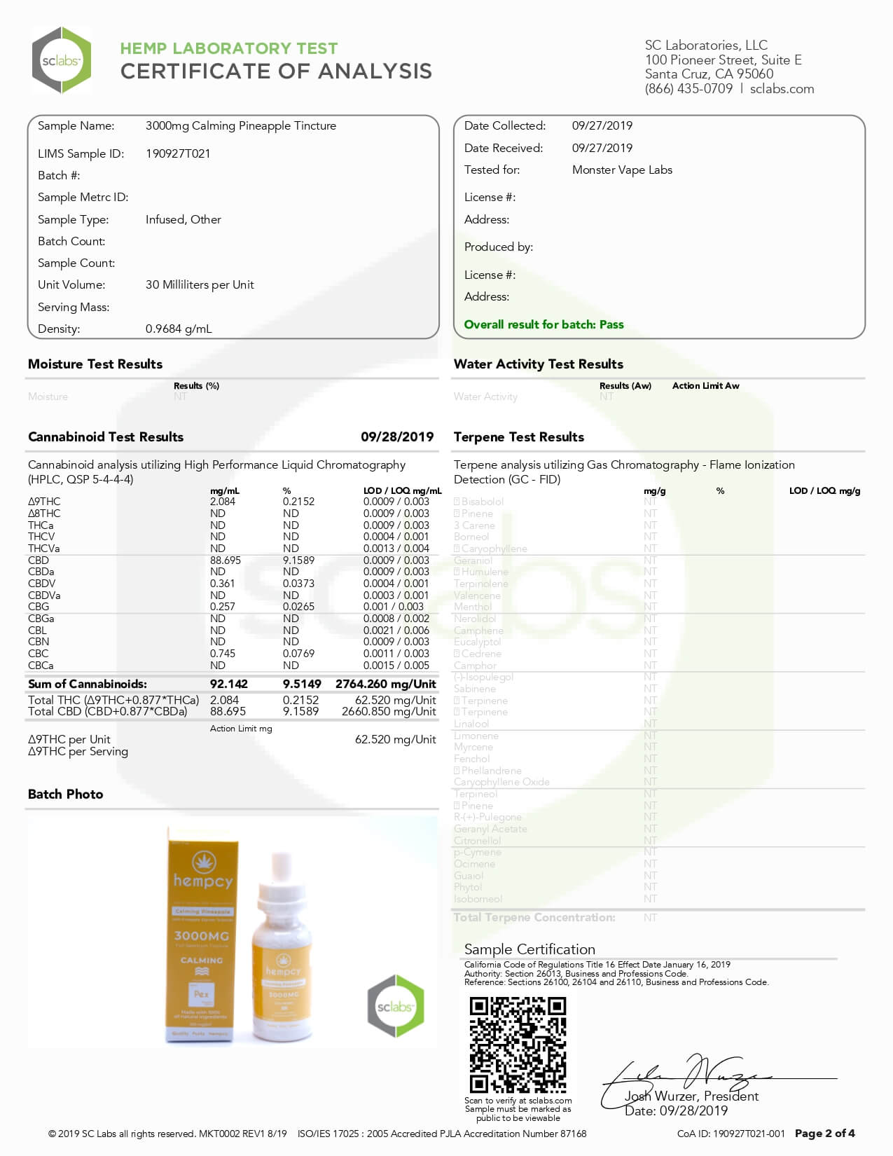 Hempcy CBD Tincture Calming Pineapple 3000mg Lab Report
