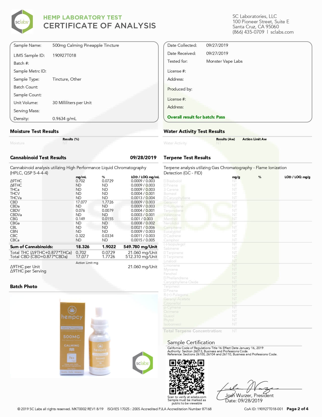 Hempcy CBD Tincture Calming Pineapple 500mg Lab Report