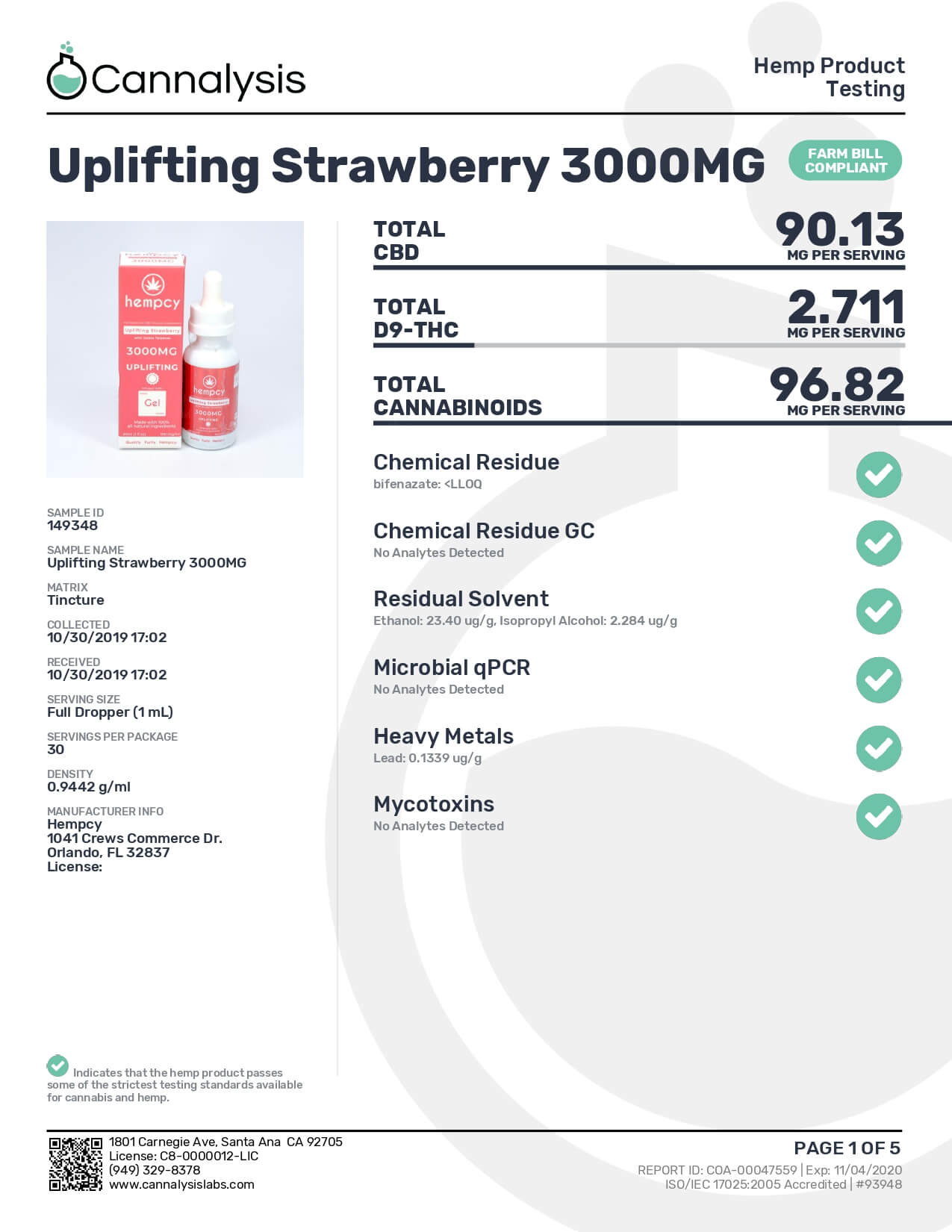 Hempcy CBD Tincture Uplifting Strawberry 3000mg Lab Report