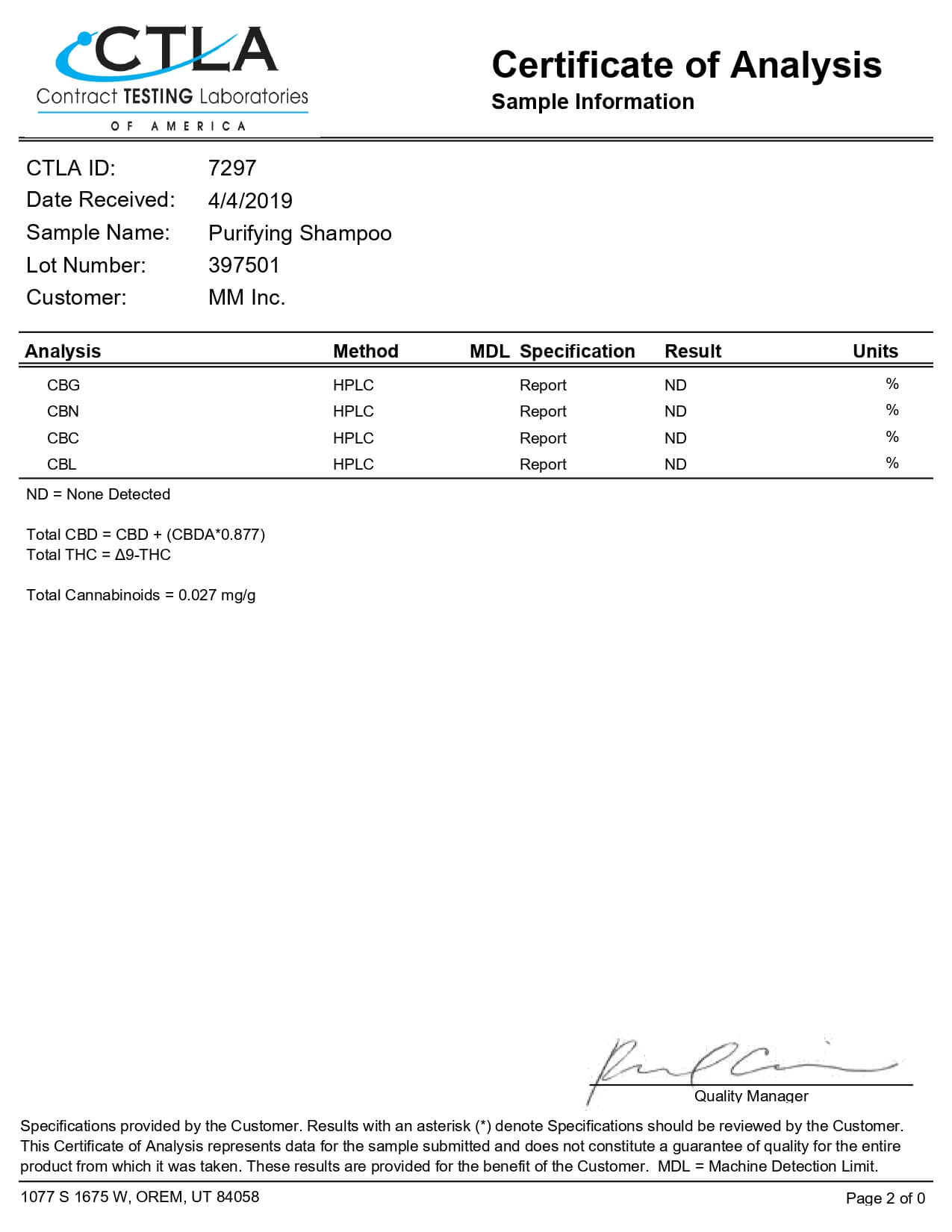 HempMeds CBD Topical Purifying Hemp Shampoo Lab Report