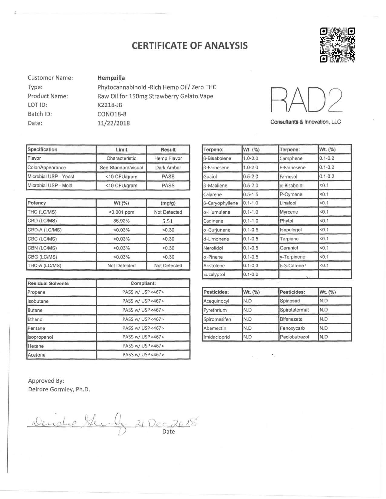 Hempzilla CBD Vape Strawberry Crème Gelato Lab Report important details about vaping products.
