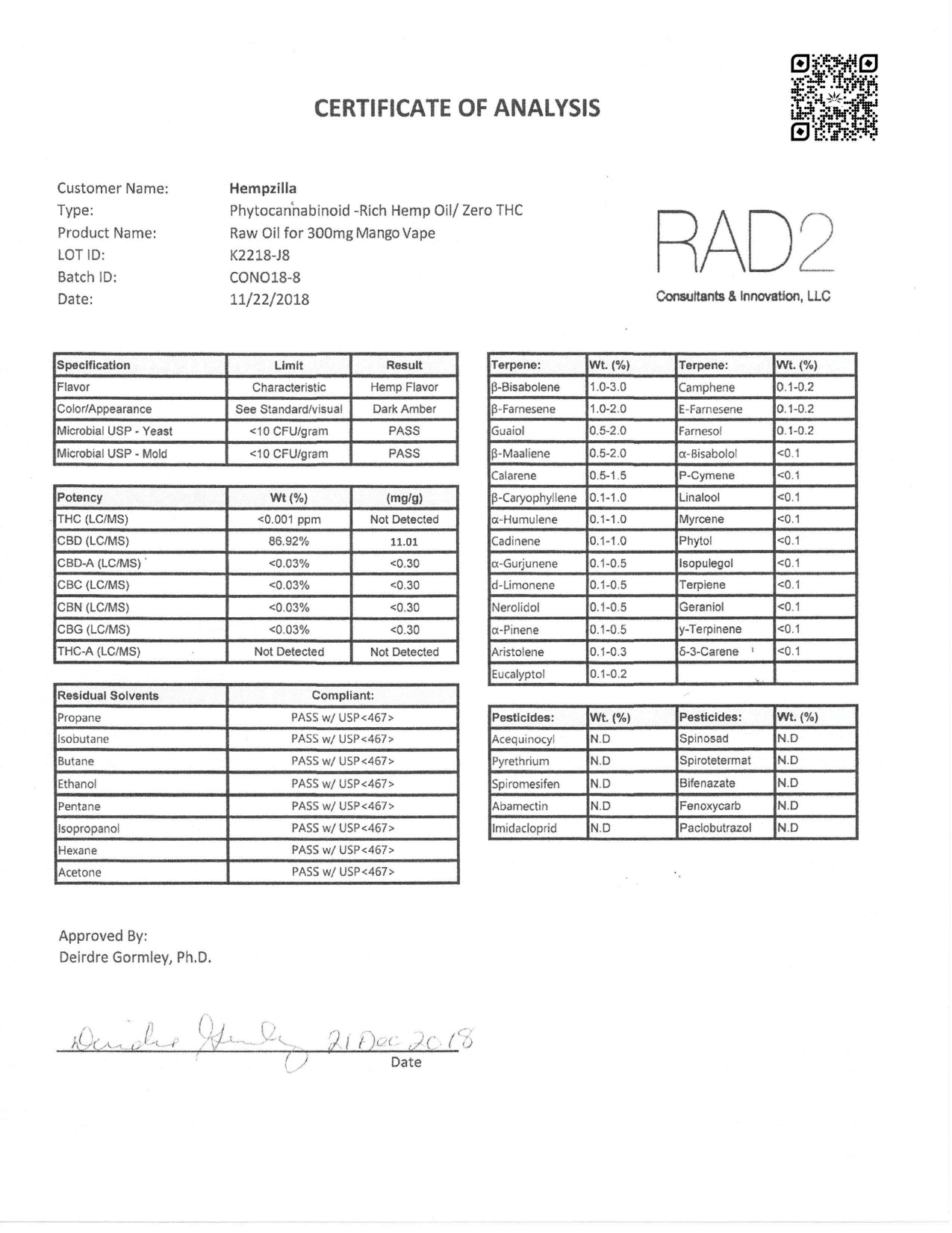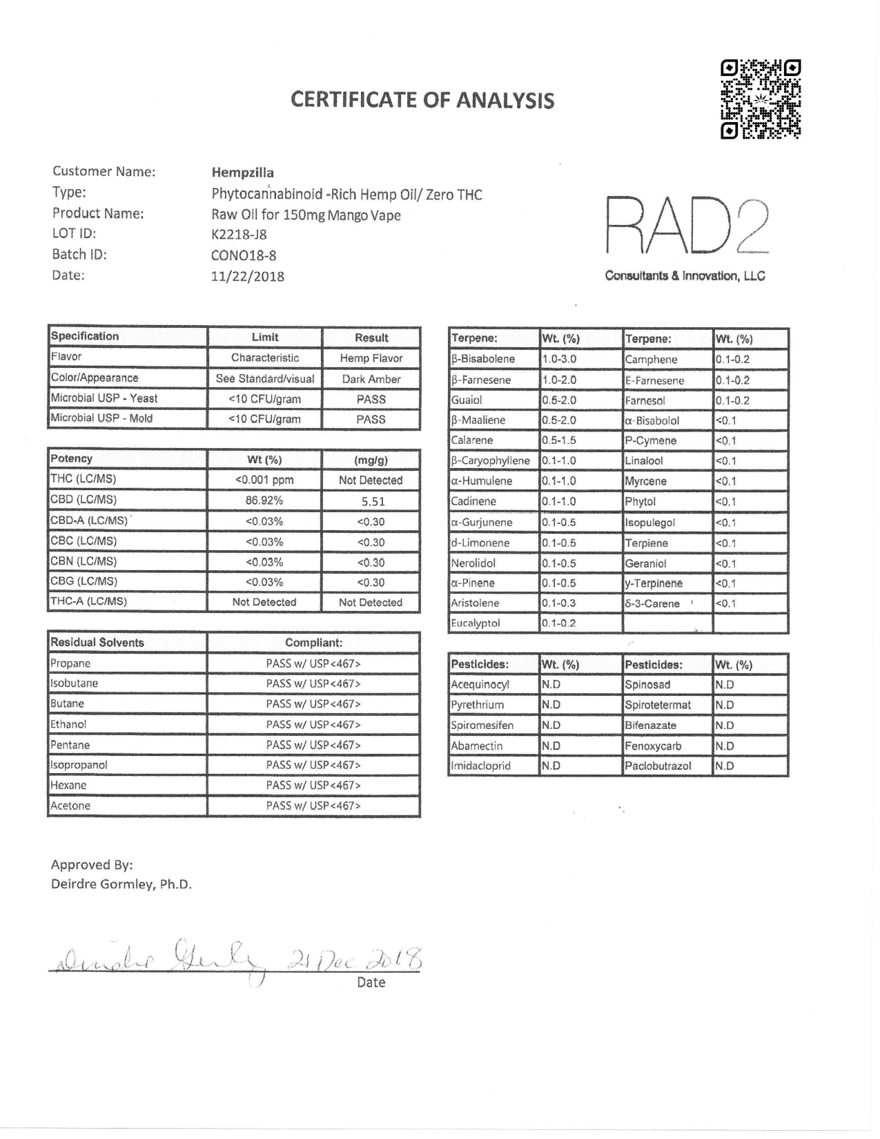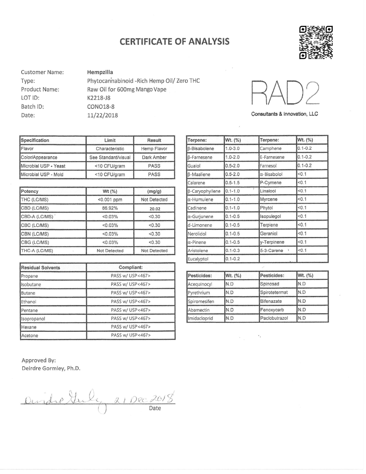 Hempzilla CBD Vape Tango Mango Lab Report important details about vaping products.