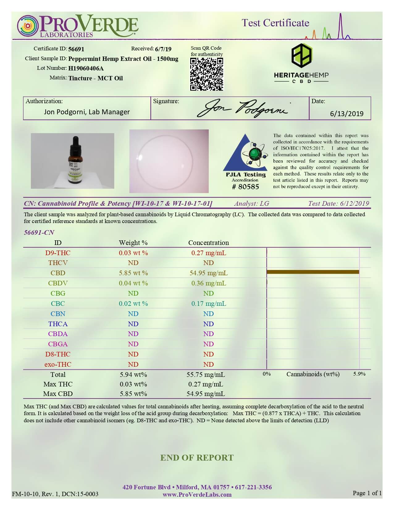 Heritage Hemp CBD Tincture Peppermint Lab Report