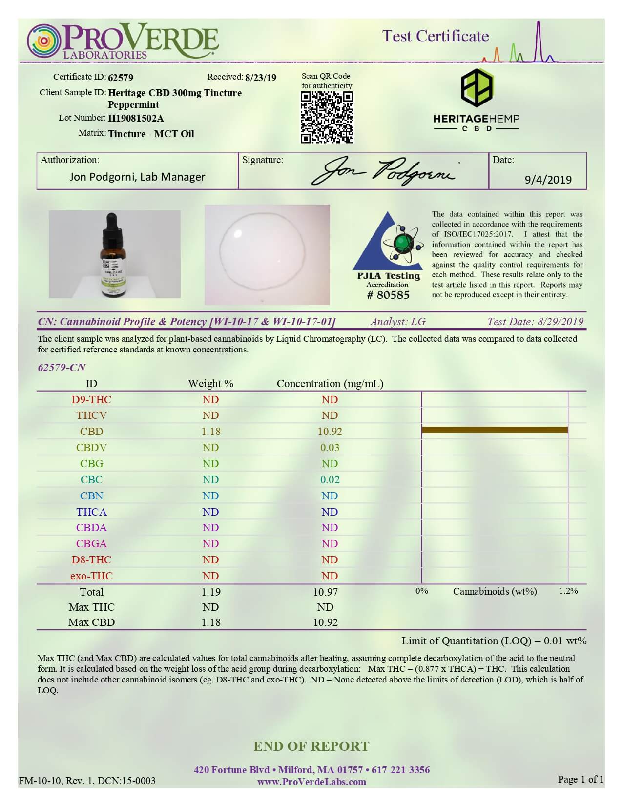 Heritage Hemp CBD Tincture Peppermint 300mg Lab Report