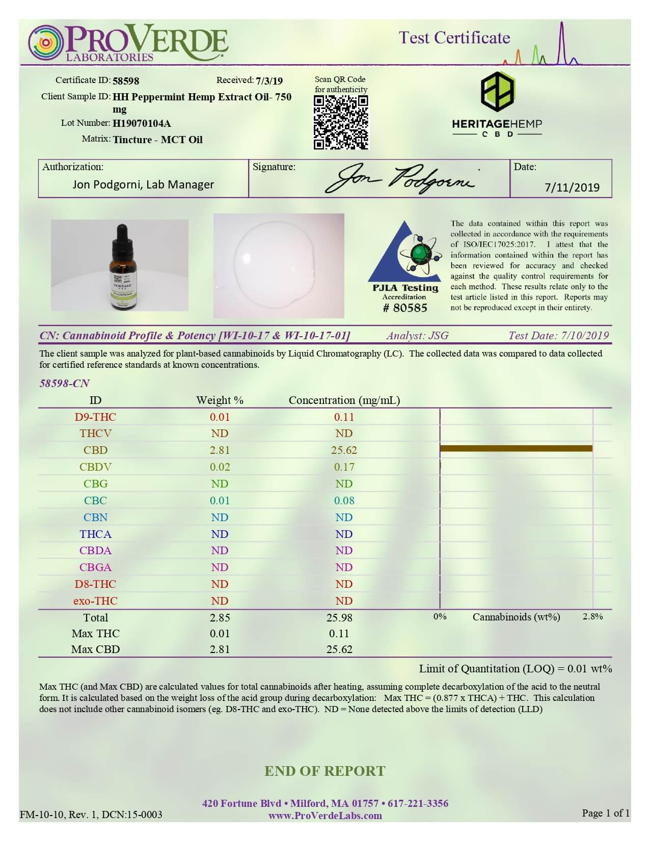 Heritage Hemp CBD Tincture Peppermint 750mg Lab Report