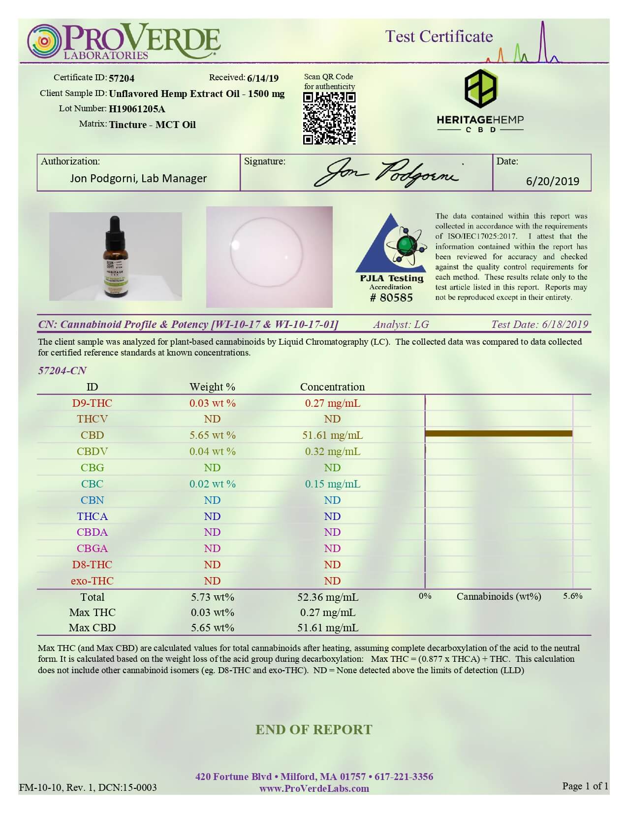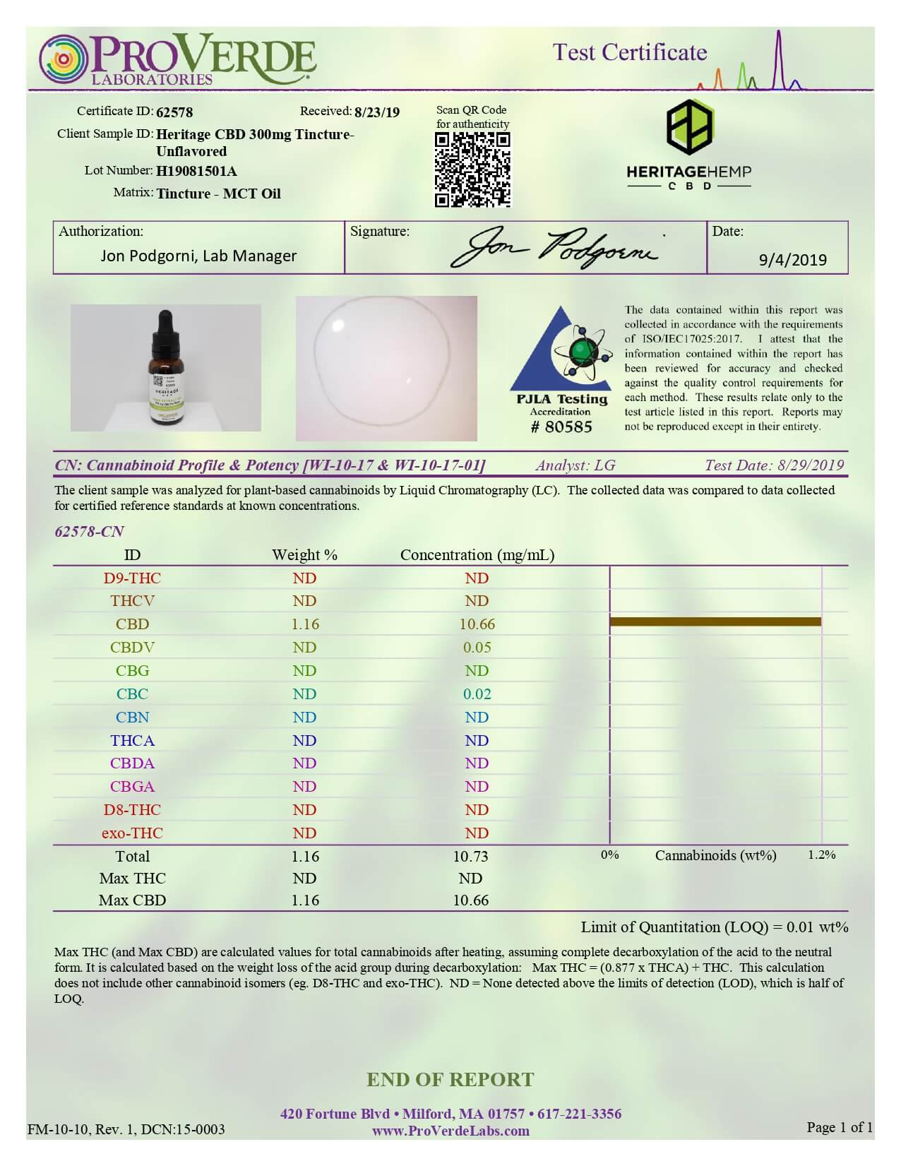 Heritage Hemp CBD Tincture Unflavored Lab Report