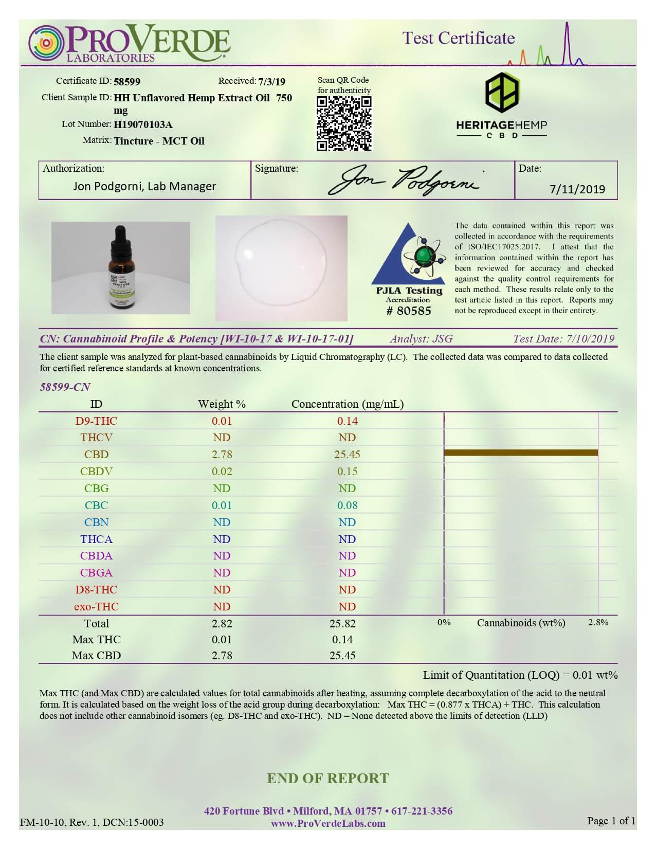 Heritage Hemp CBD Tincture Unflavored 750mg Lab Report