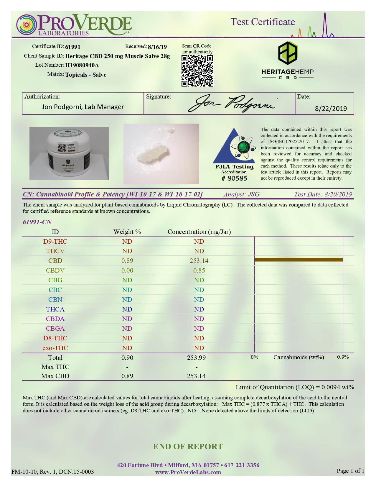 Heritage Hemp CBD Topical Muscle Salve 250mg Lab Report