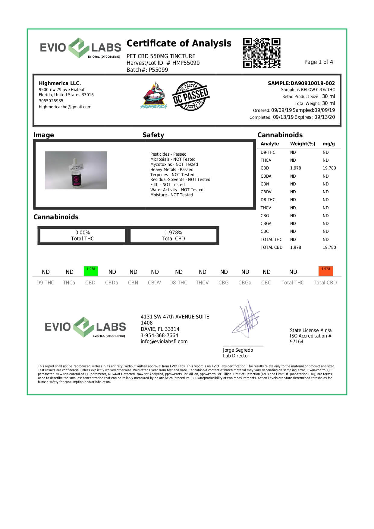 Highmerica CBD Pet Tincture Unflavored Lab Report important details about vaping products.