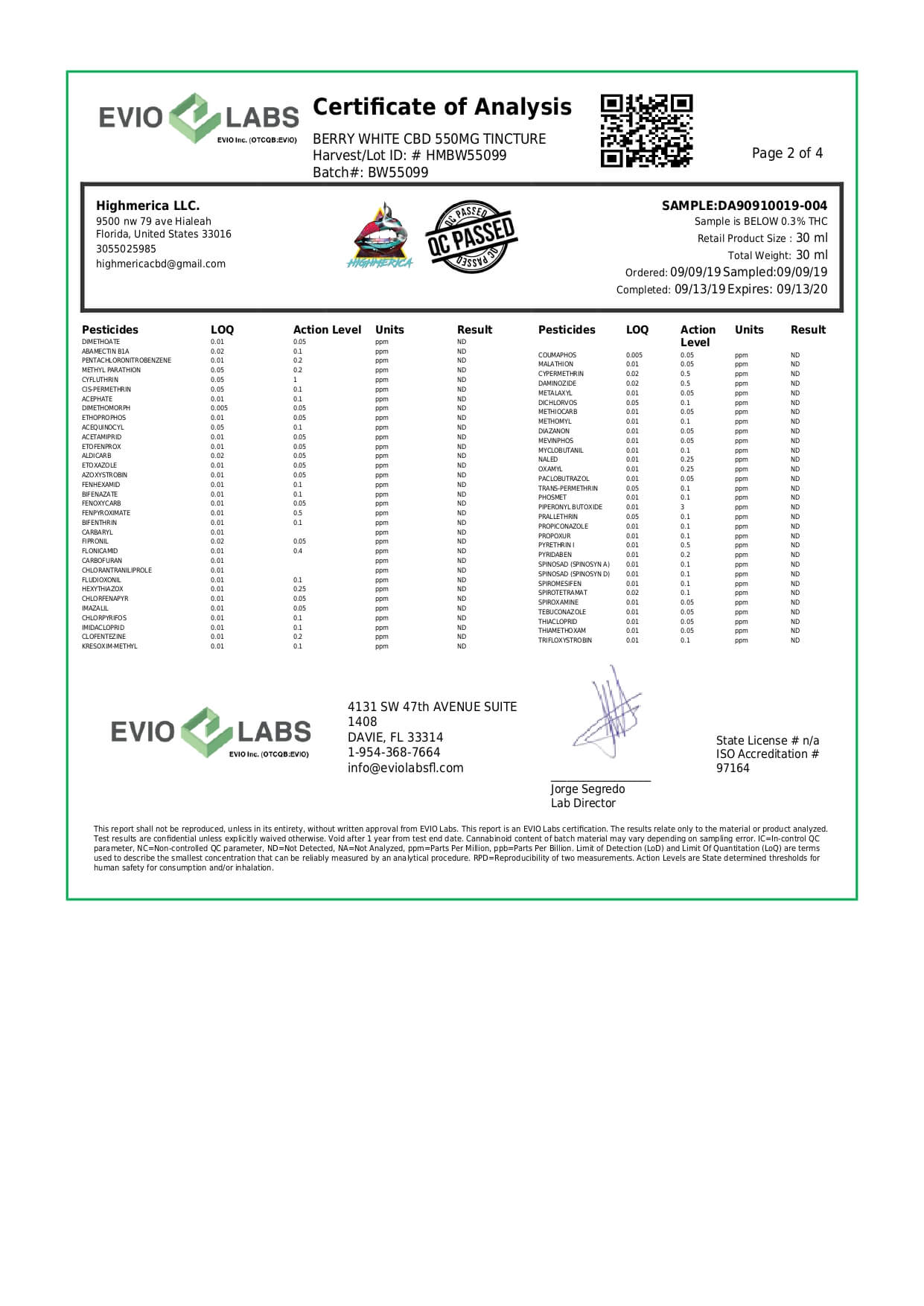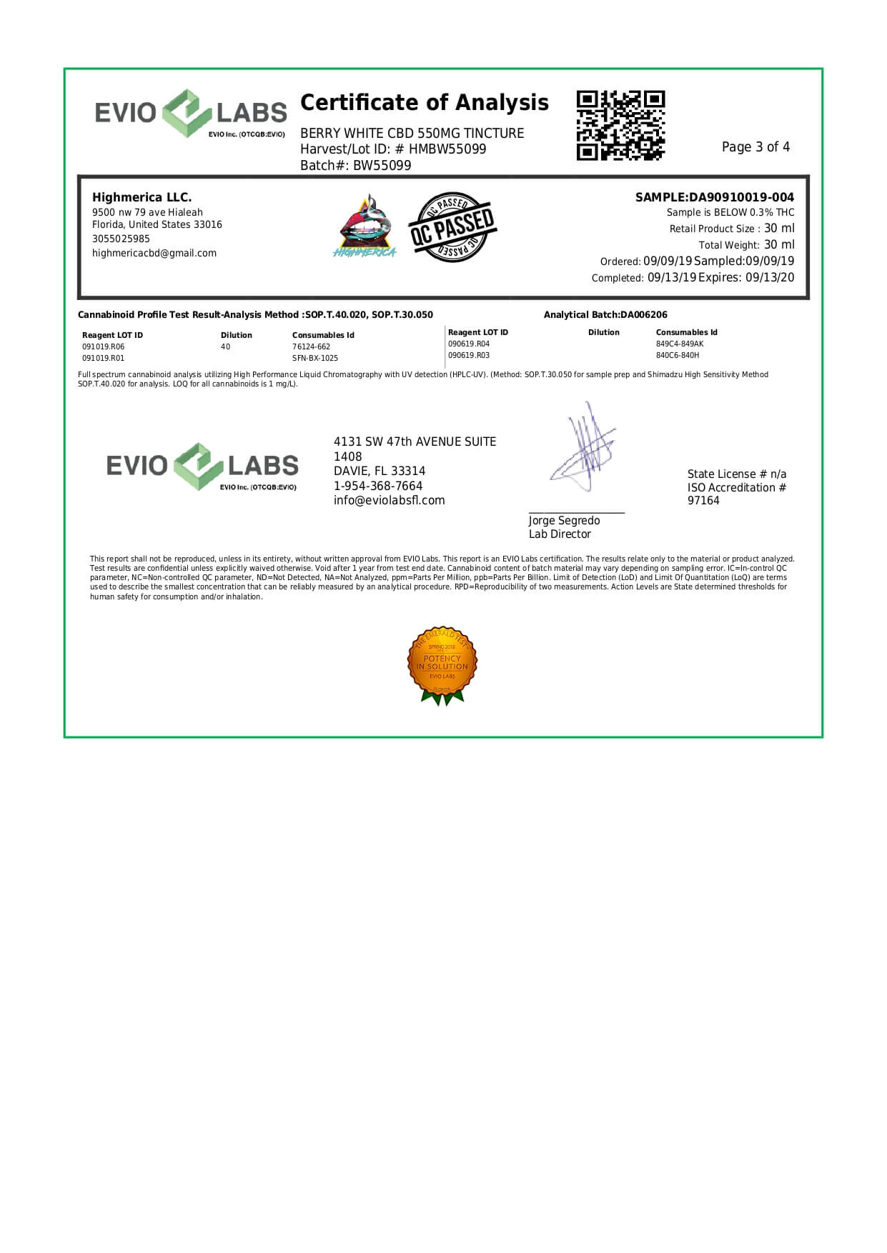 Highmerica CBD Terpenes Oil Berry White Lab Report important details about vaping products.