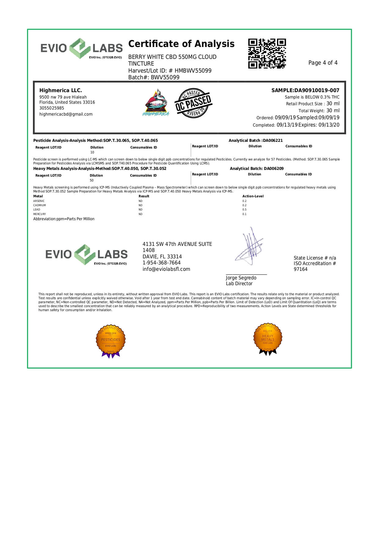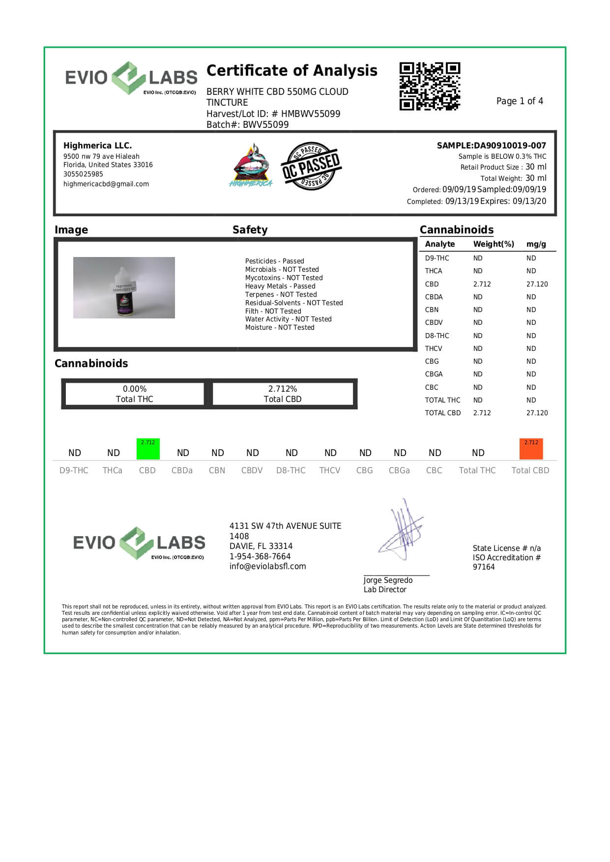 Highmerica CBD Vape Tincture Berry White Lab Report important details about vaping products.