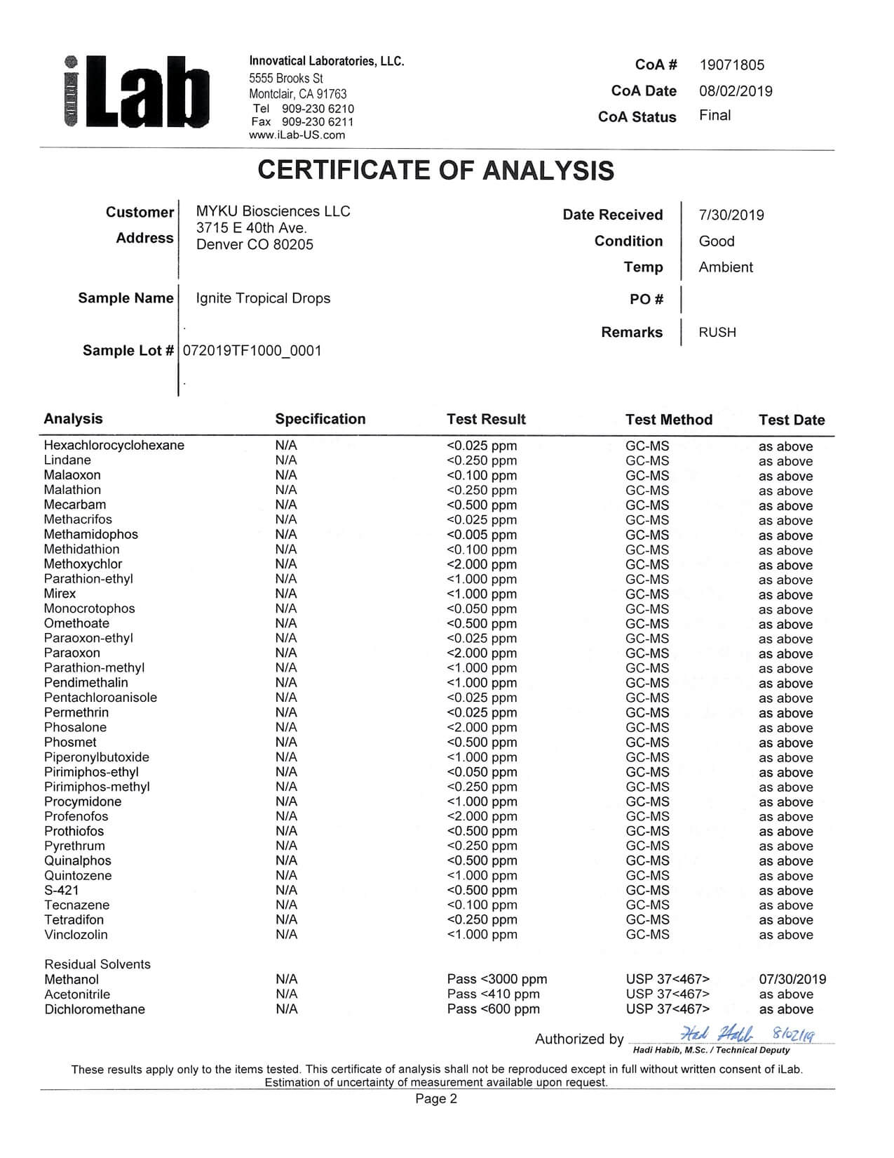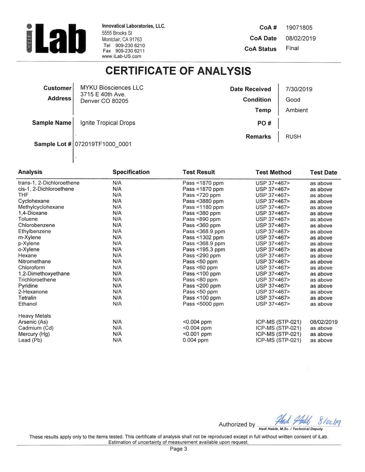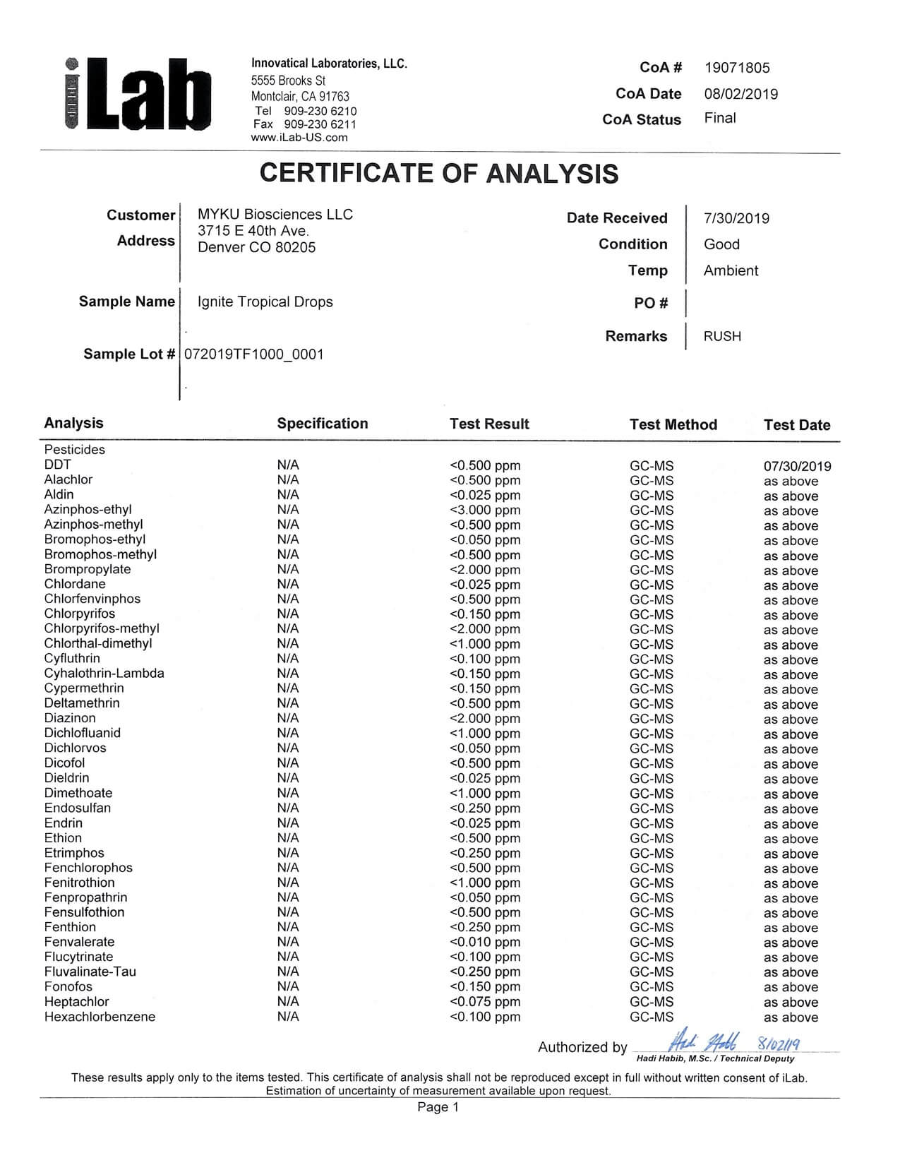IGNITE CBD Oil Drops Tropical Fruit (Recharge) Lab Reports findings to identify facts related to vapes products.