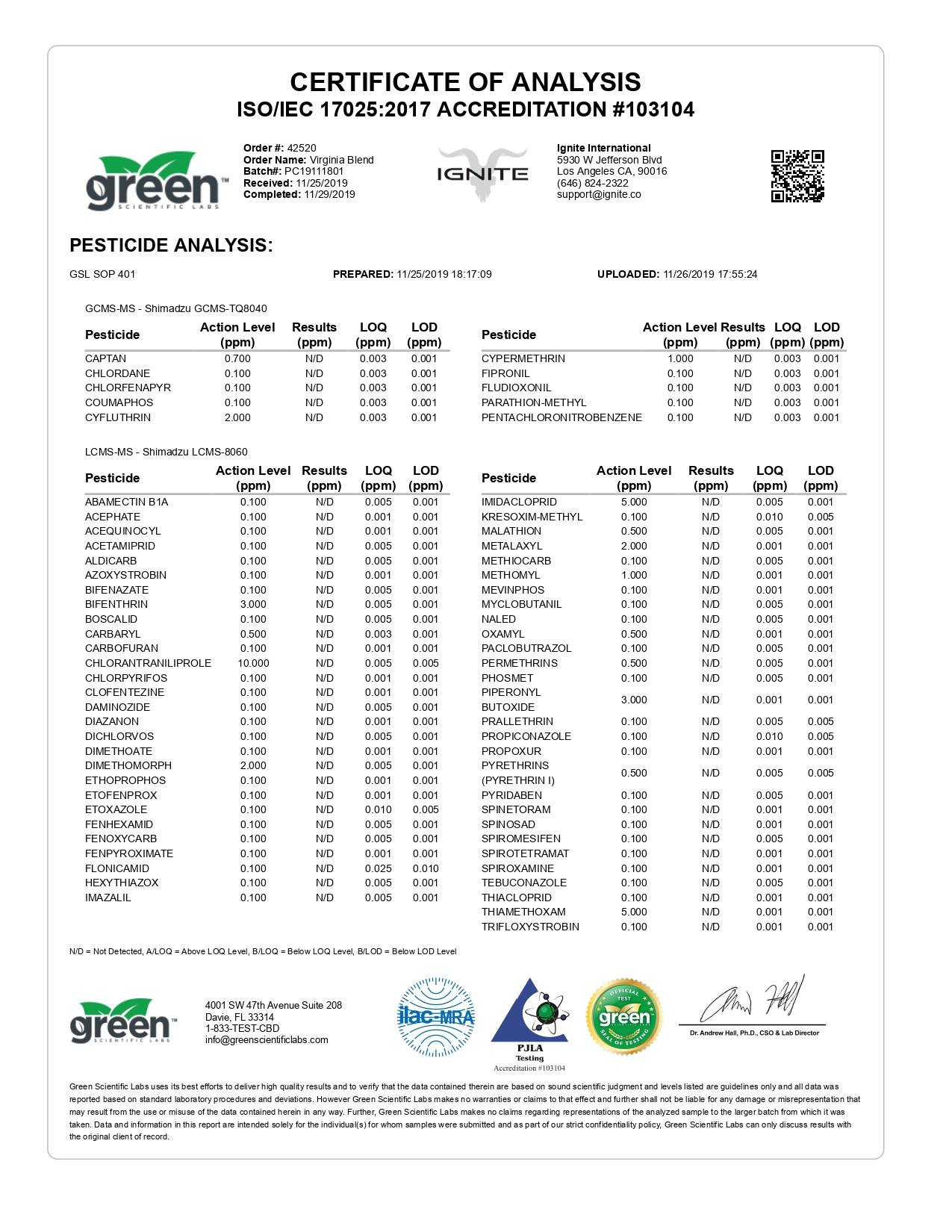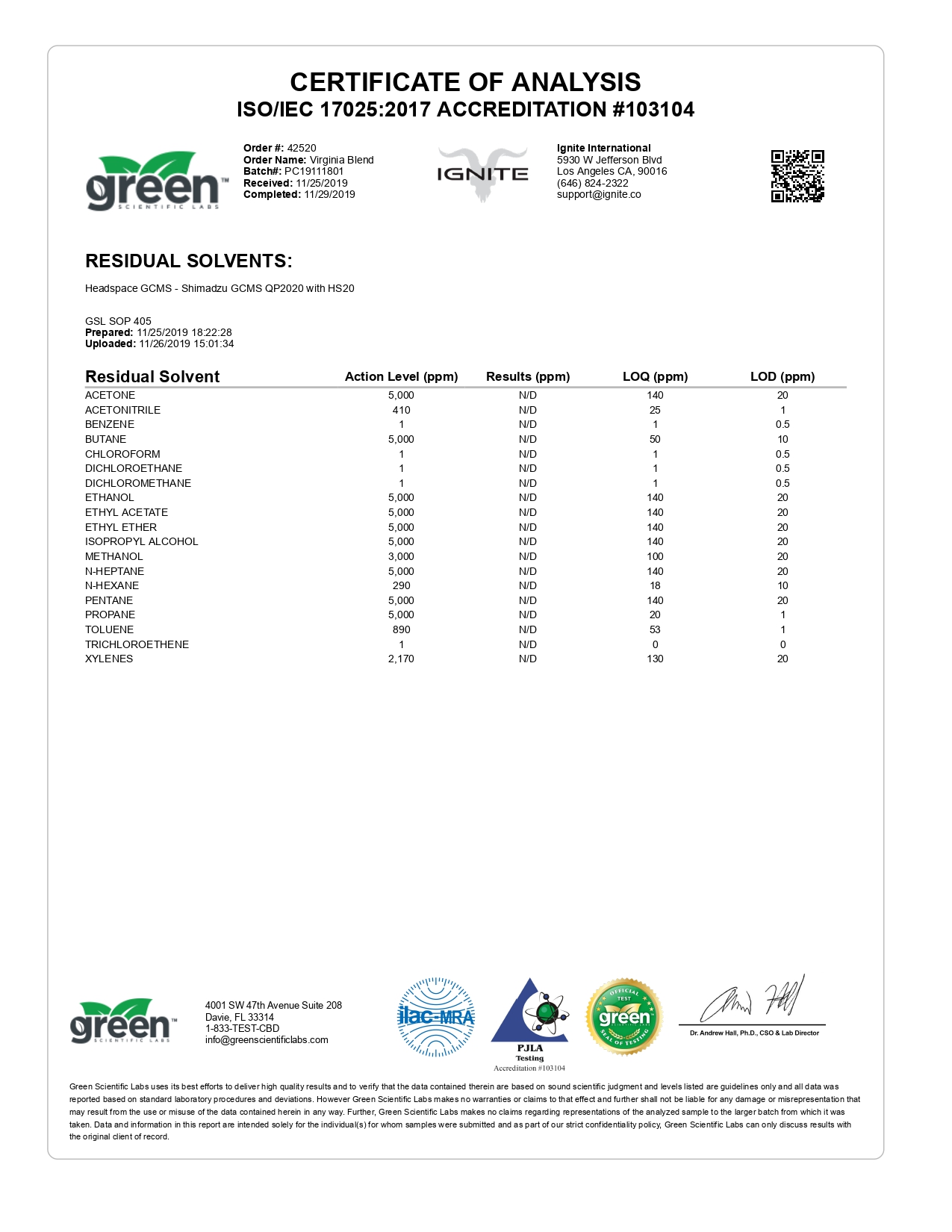 IGNITE CBD Pod Virginia Blend Lab Report important details about vaping products.