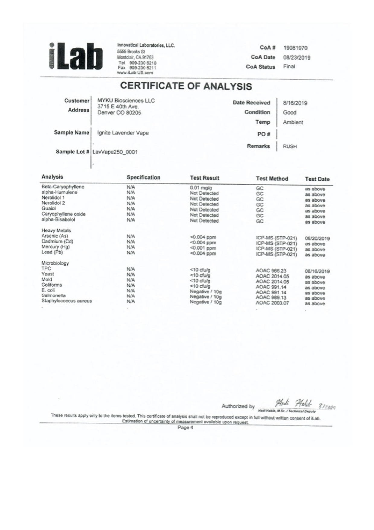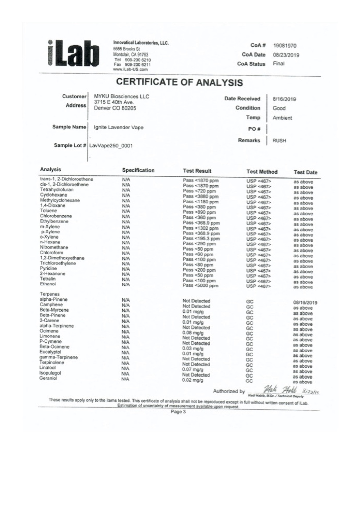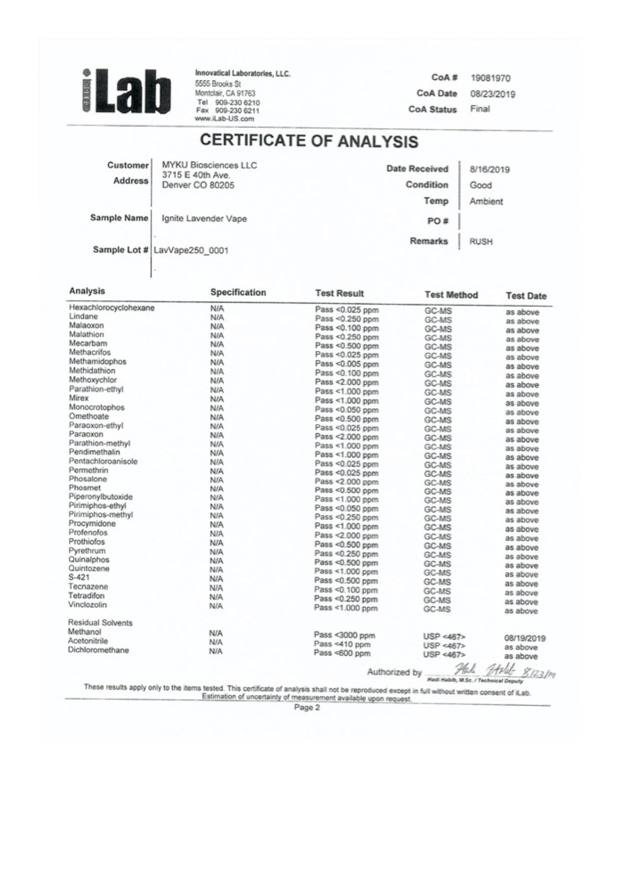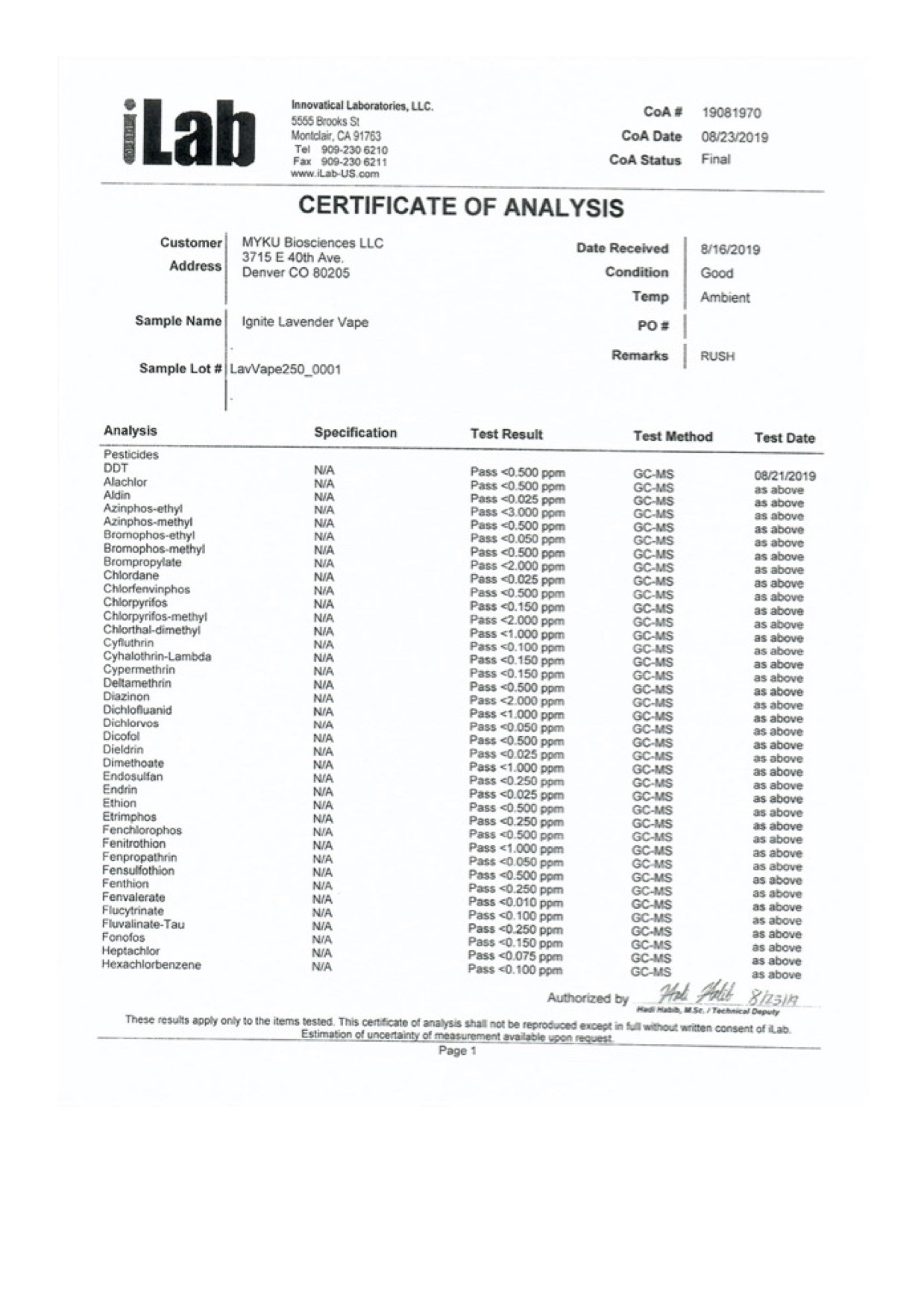 IGNITE CBD Vape Pen Lavender (Calm) Lab Report concluding results about vapes products.