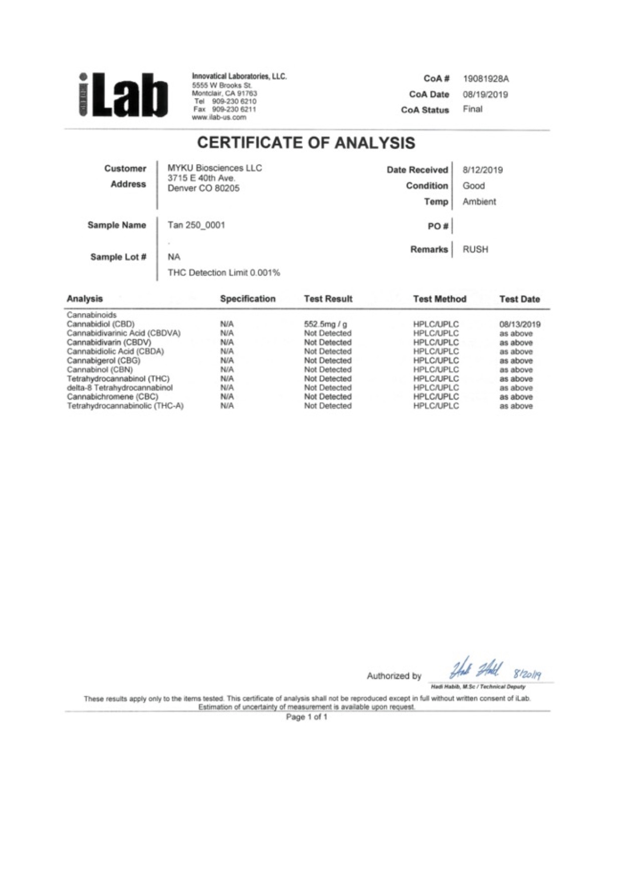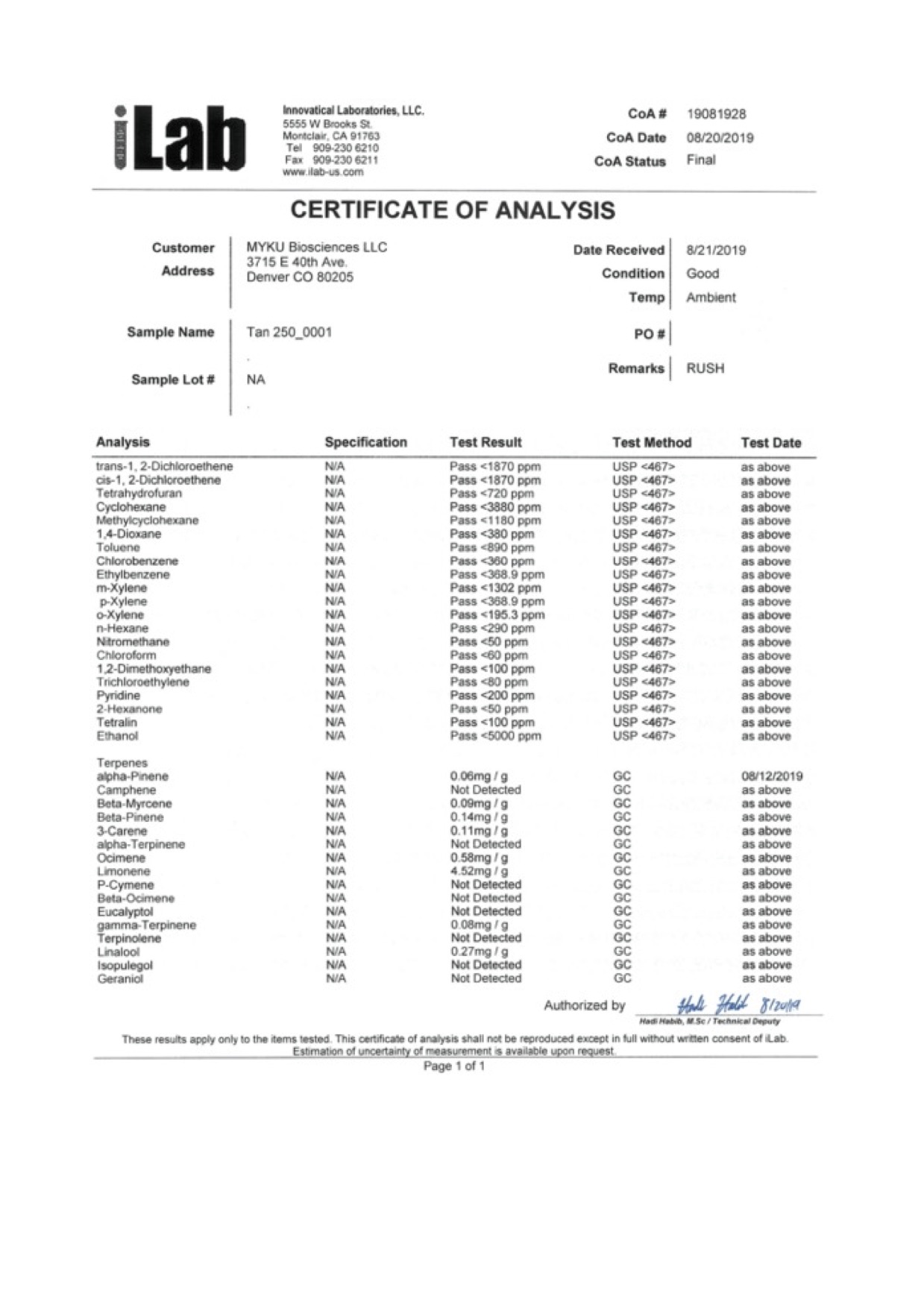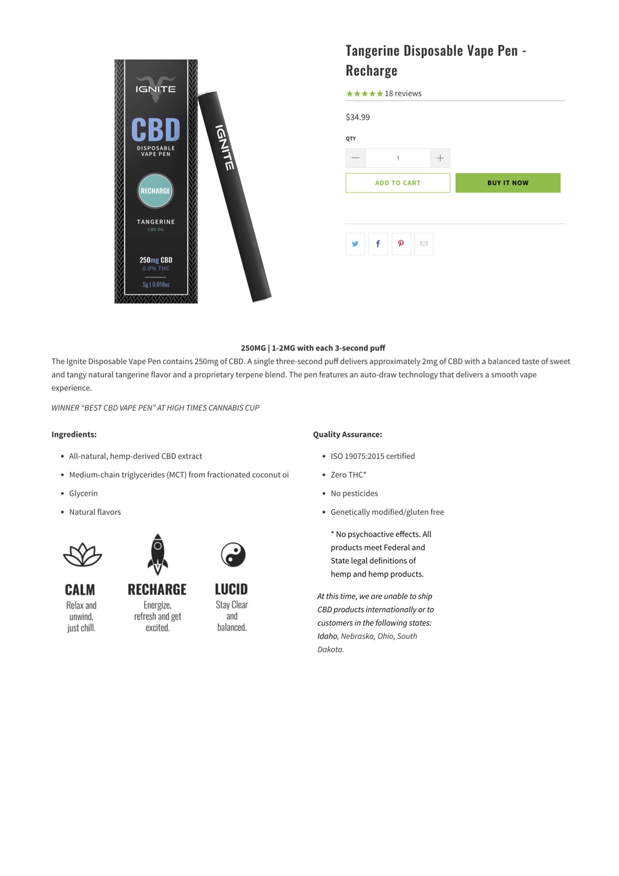 IGNITE CBD Vape Pen Tangerine (Recharge) Lab Report specifically related to vapes products.