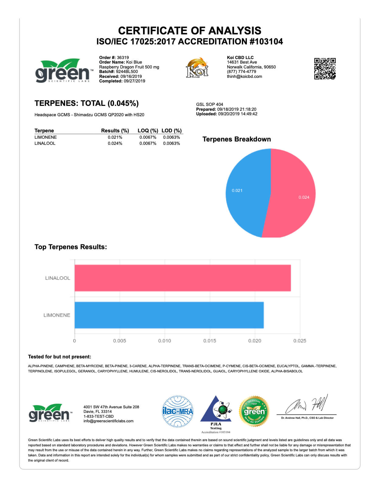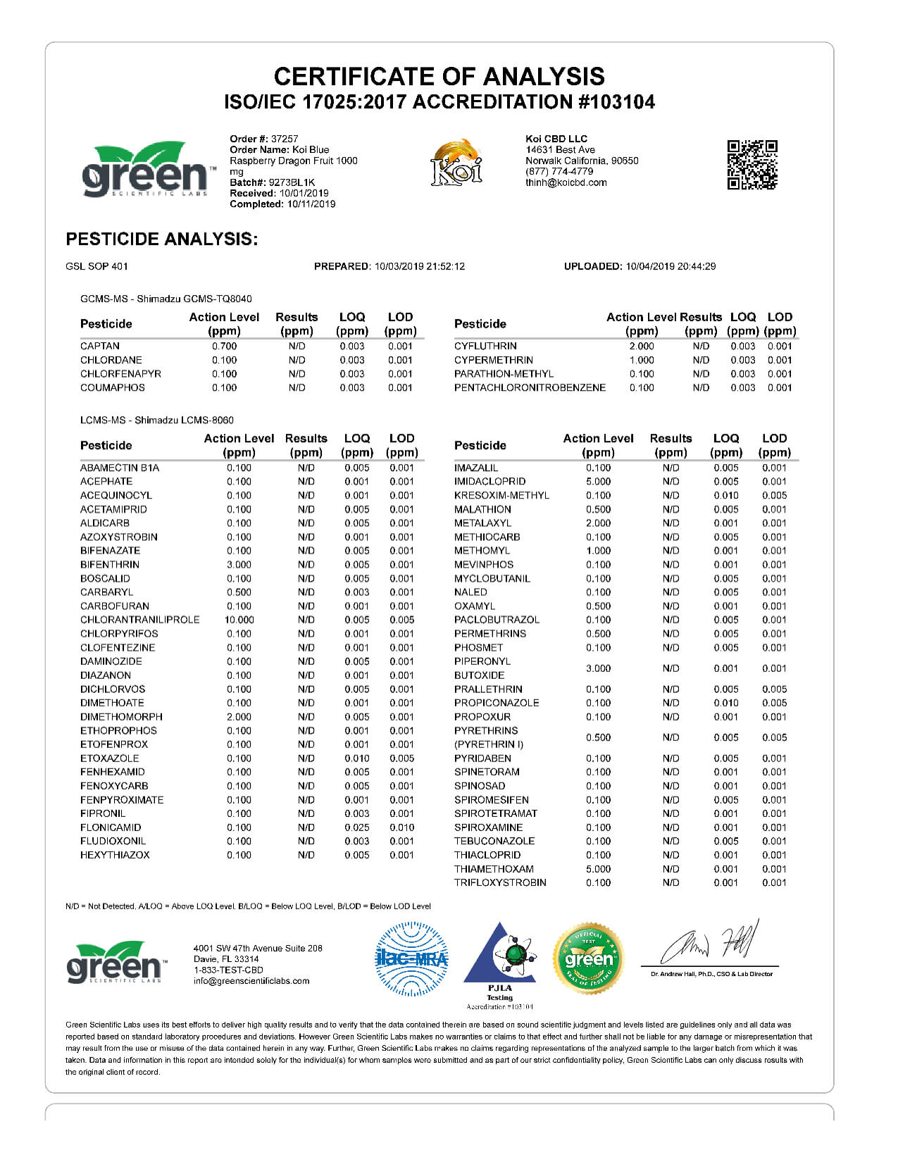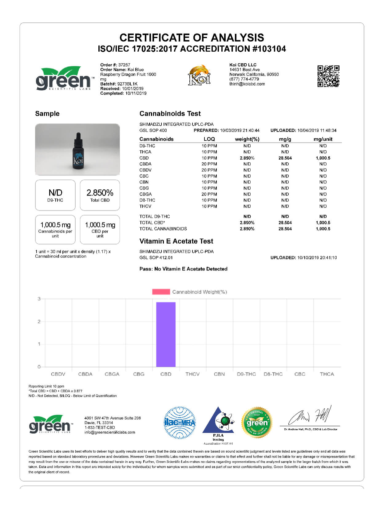 Koi CBD Blue Raspberry Dragon Fruit Lab Reports presented results to assure an understanding related to vapes products.