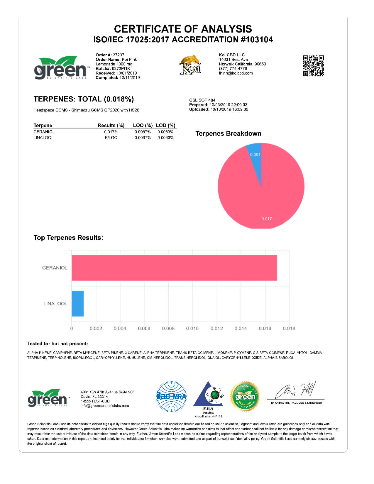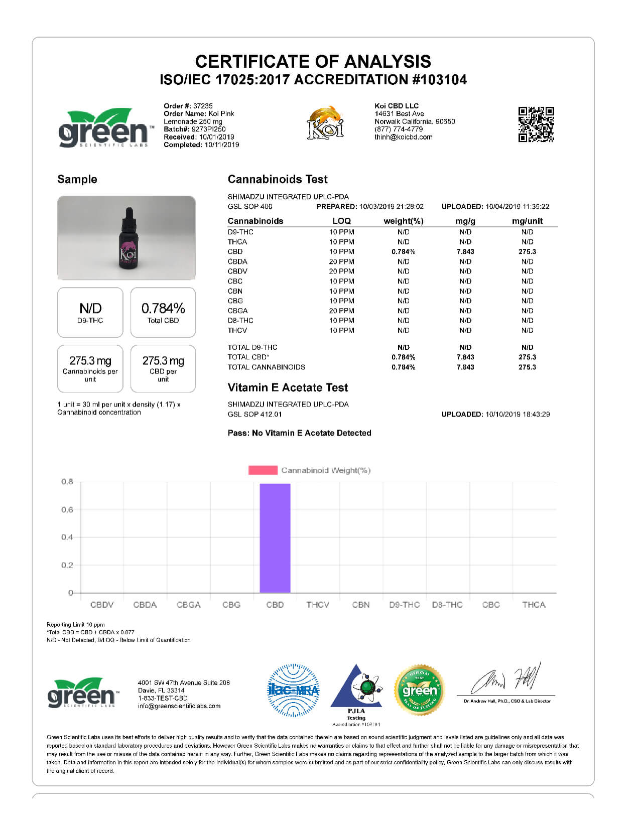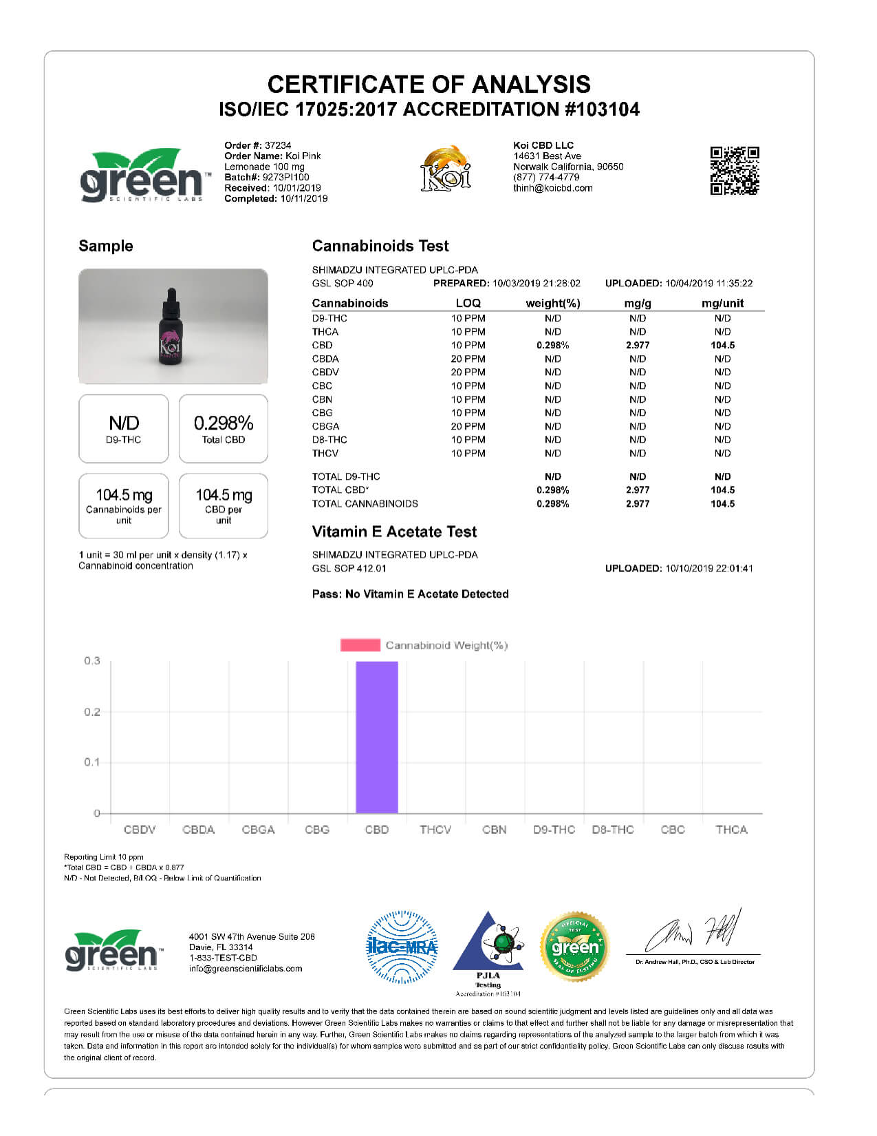 Koi CBD Pink Lemonade Vape Oil Lab Reports results with reference to vapes products.