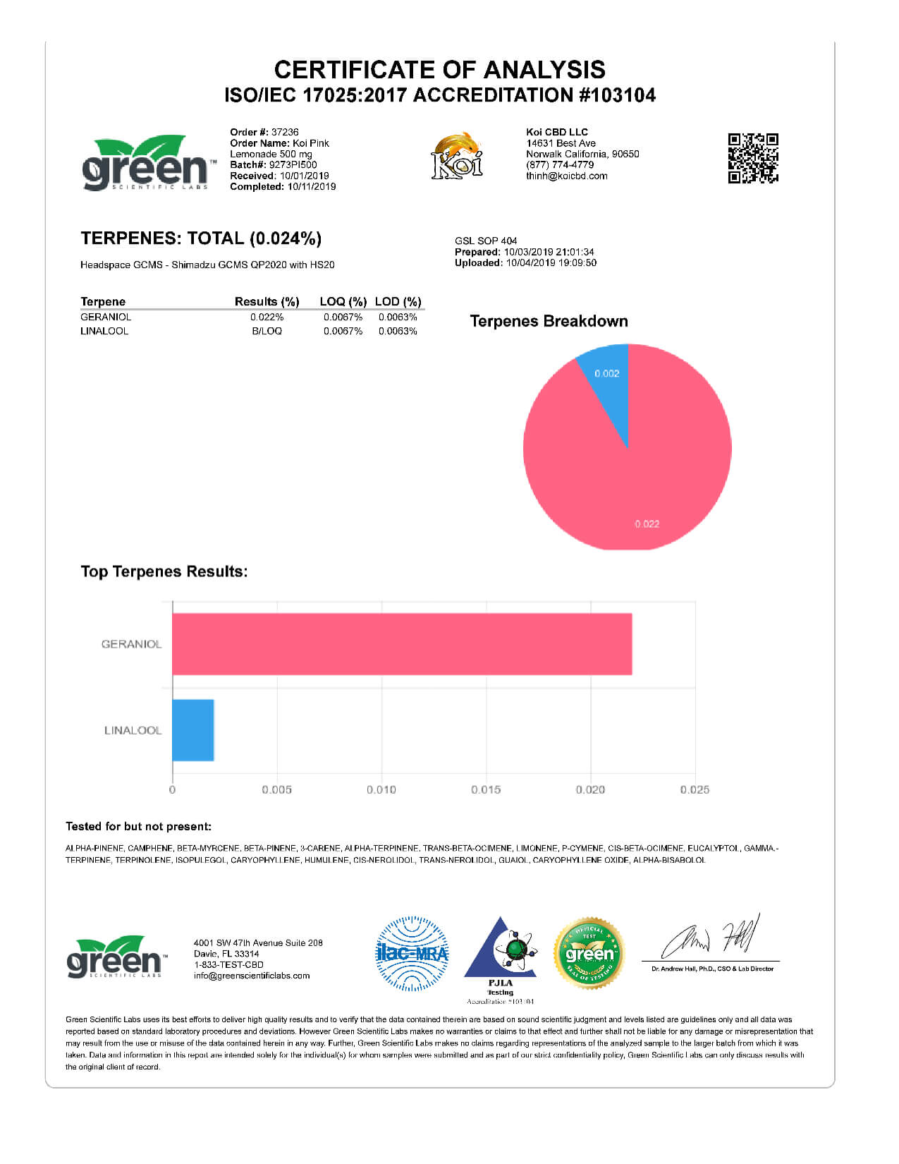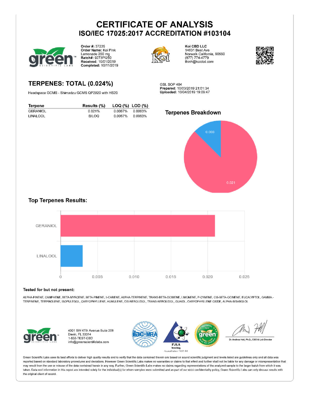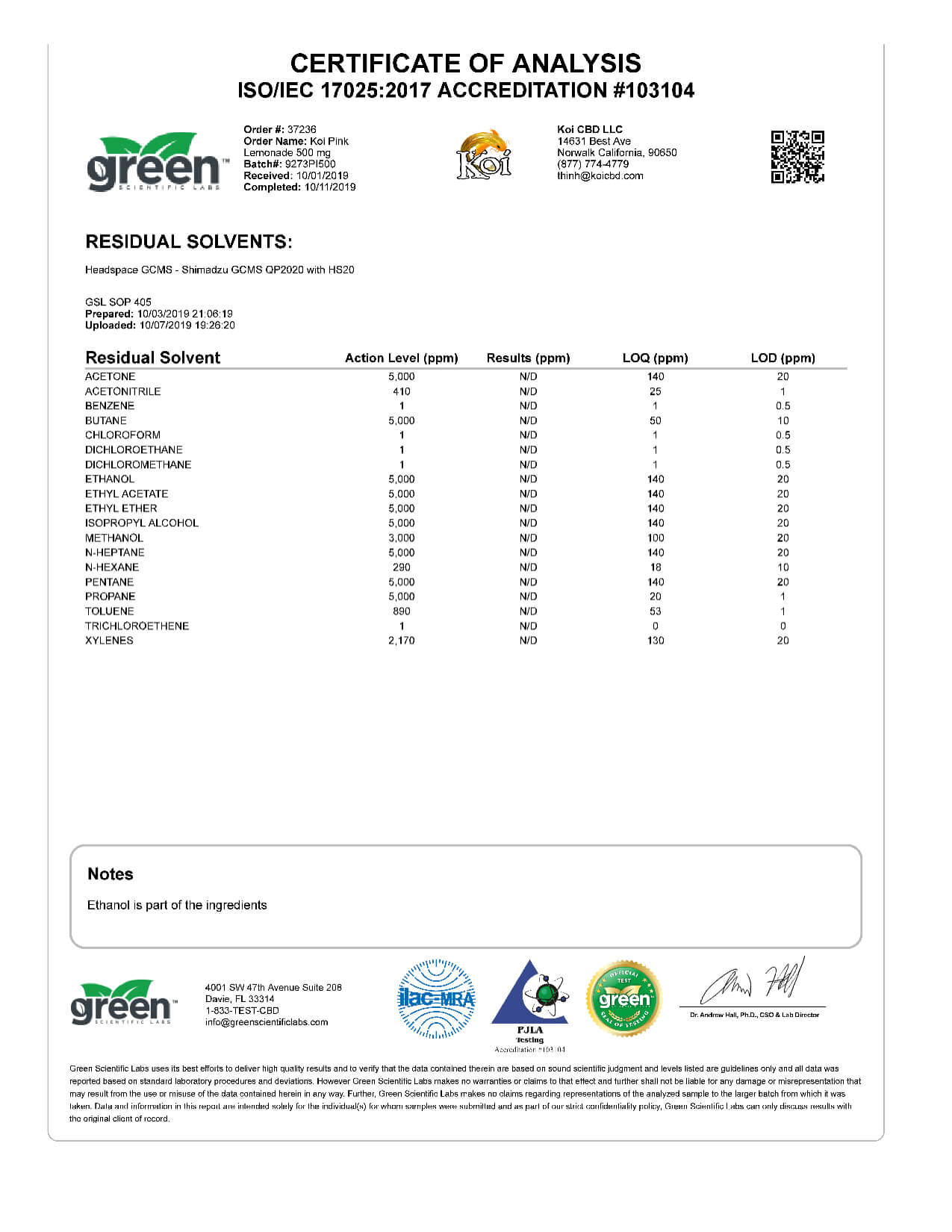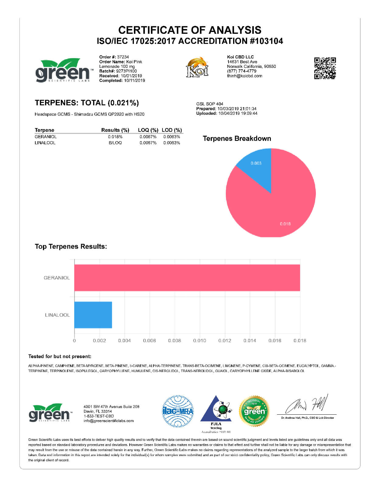 Koi CBD Pink Lemonade Vape Oil Lab Reports results with reference to vapes products.