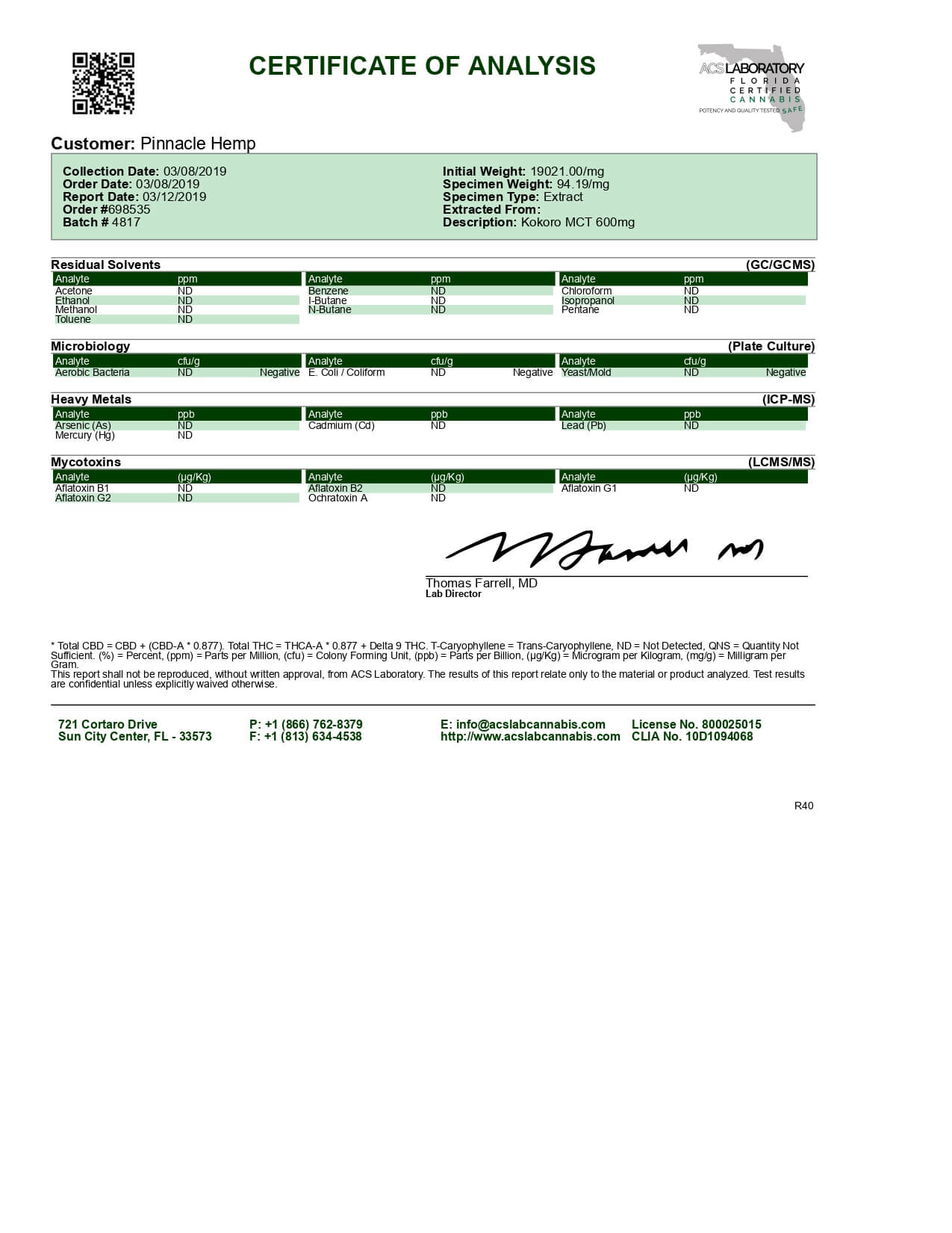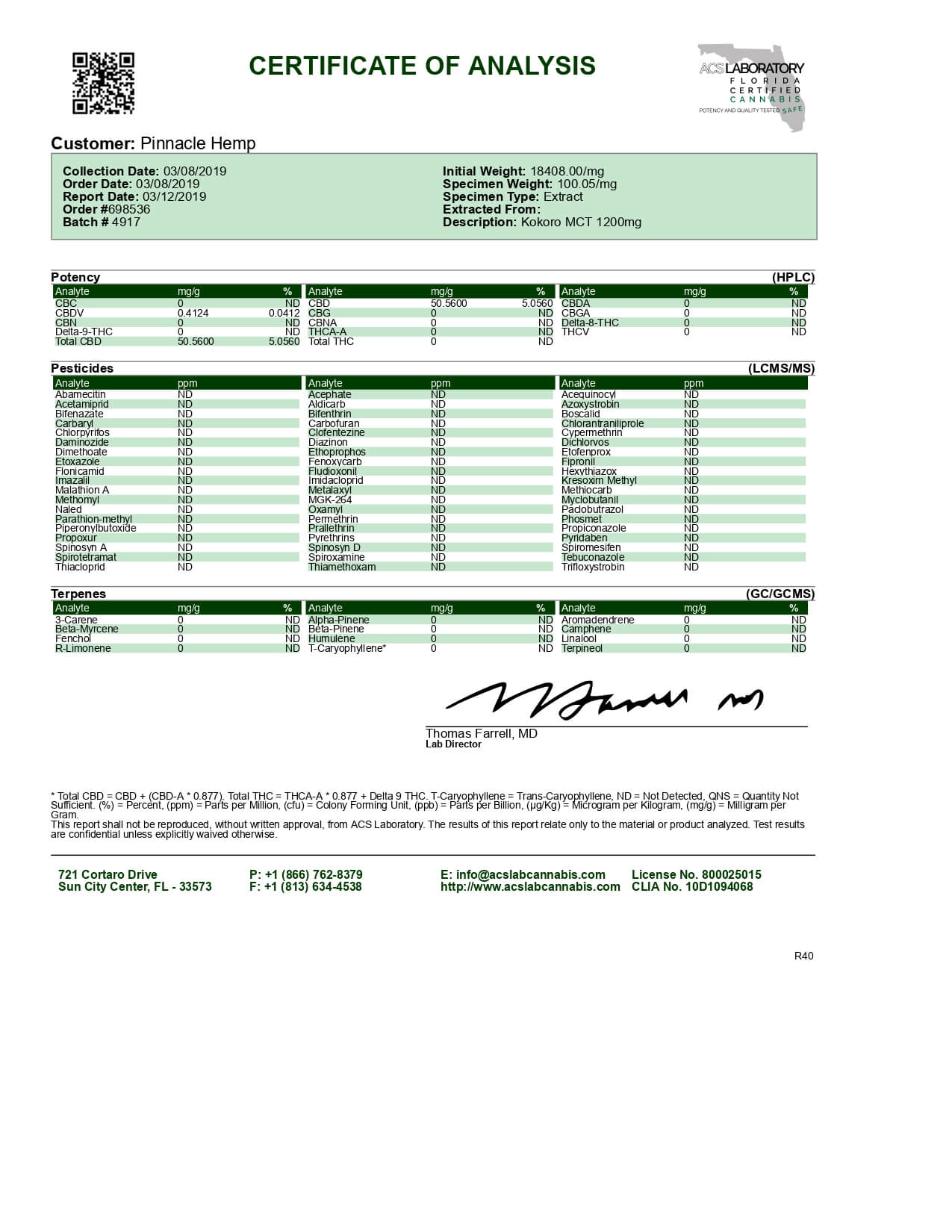Kokoro CBD Tincture Broad Spectrum MCT Oil Lab Report