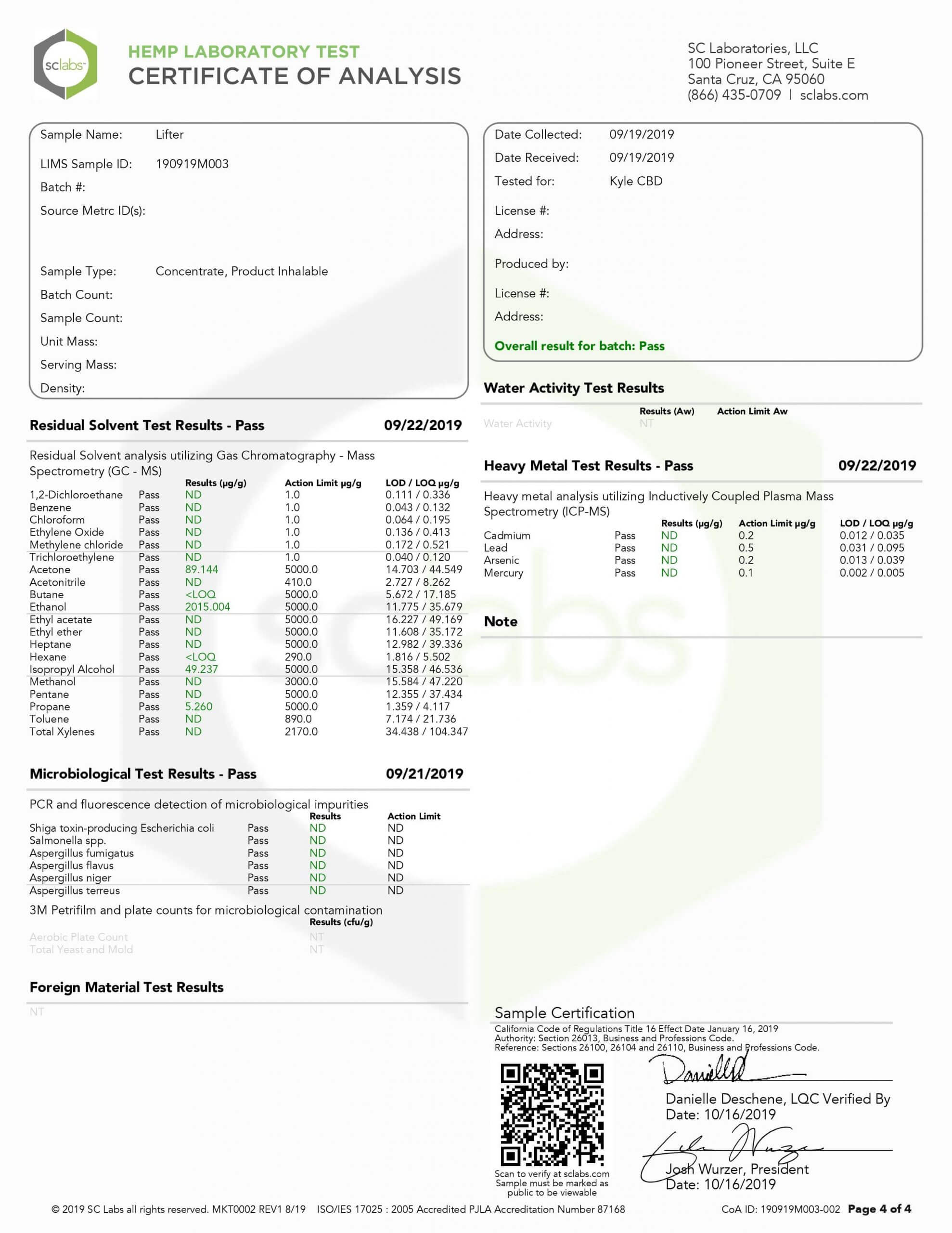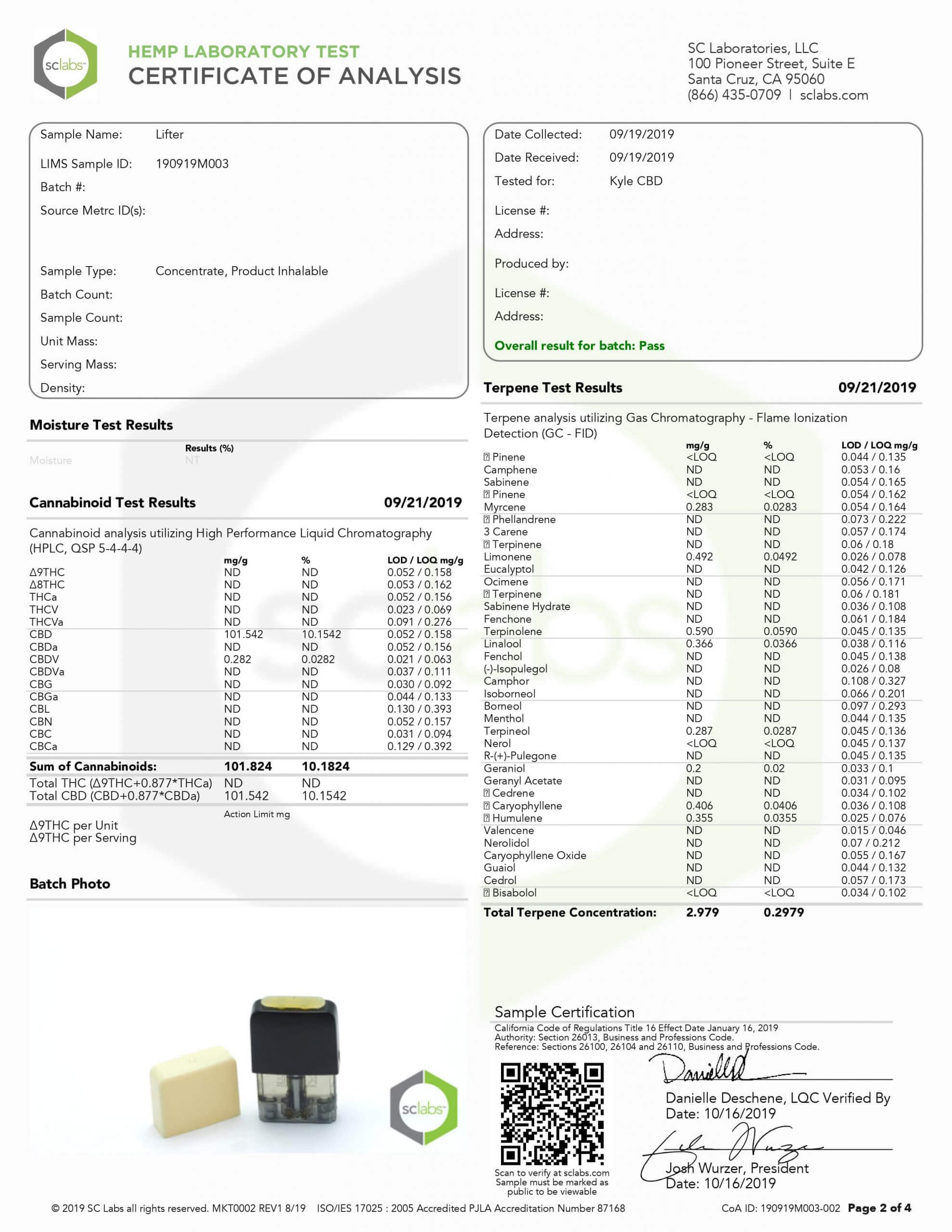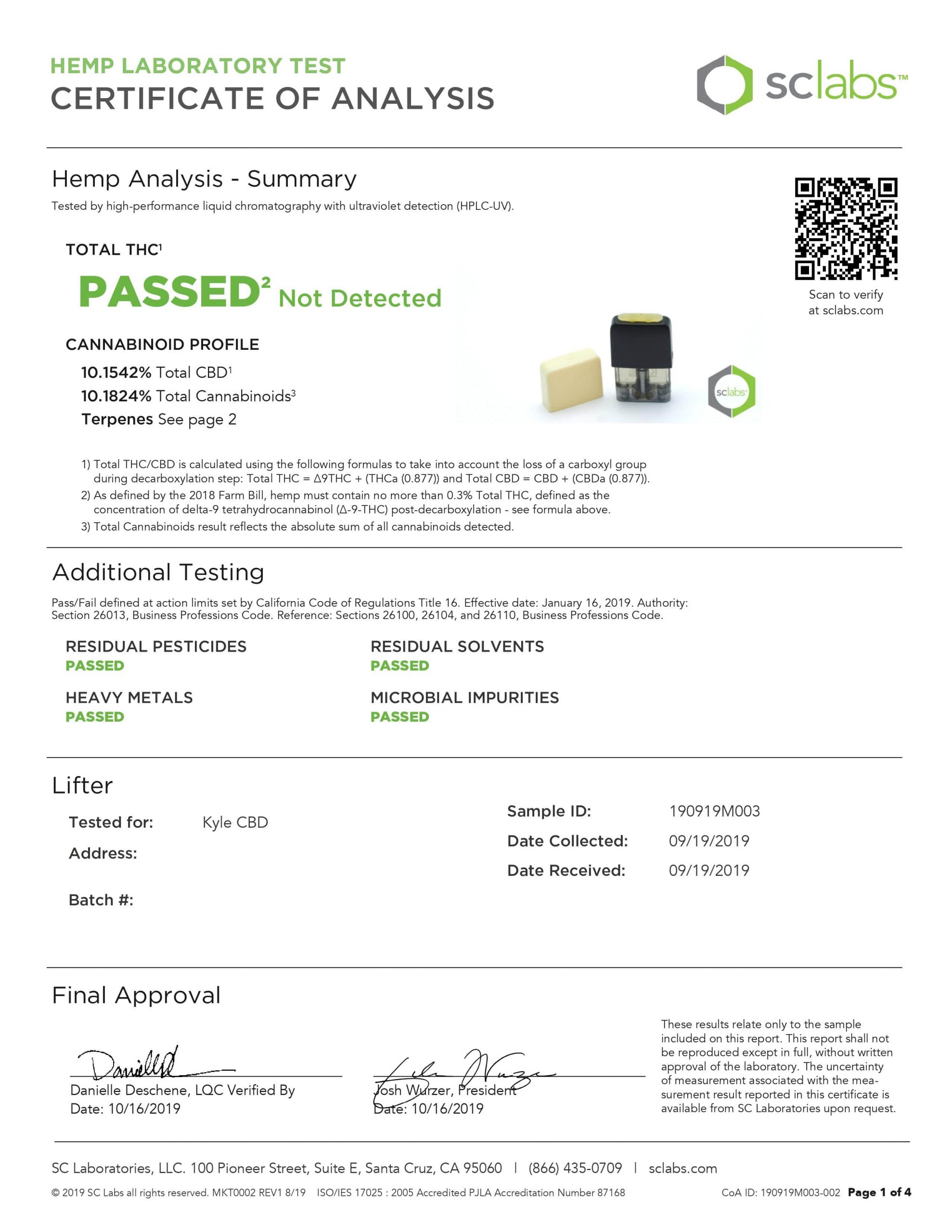 KYLE CBD Pods Lifter Hemp Lab Report