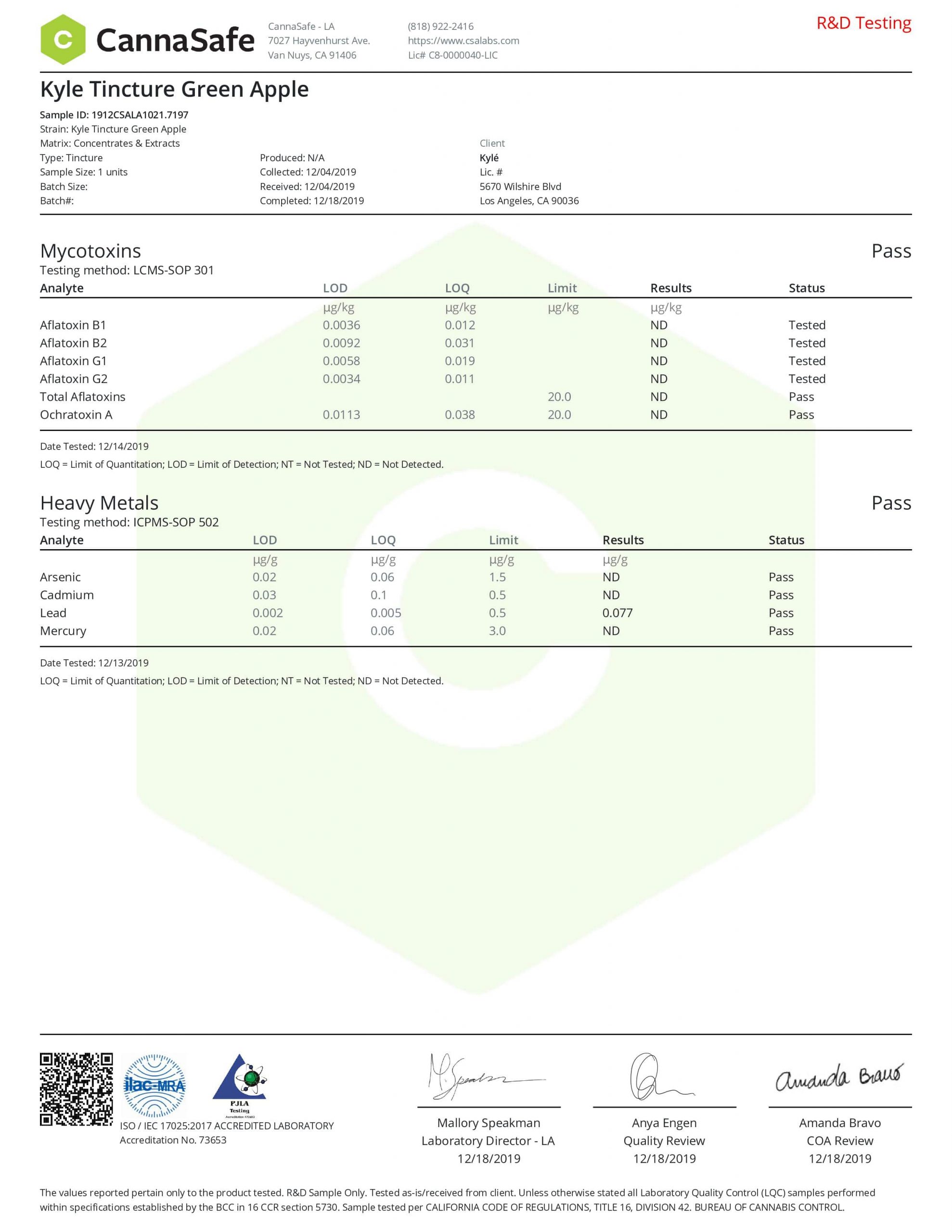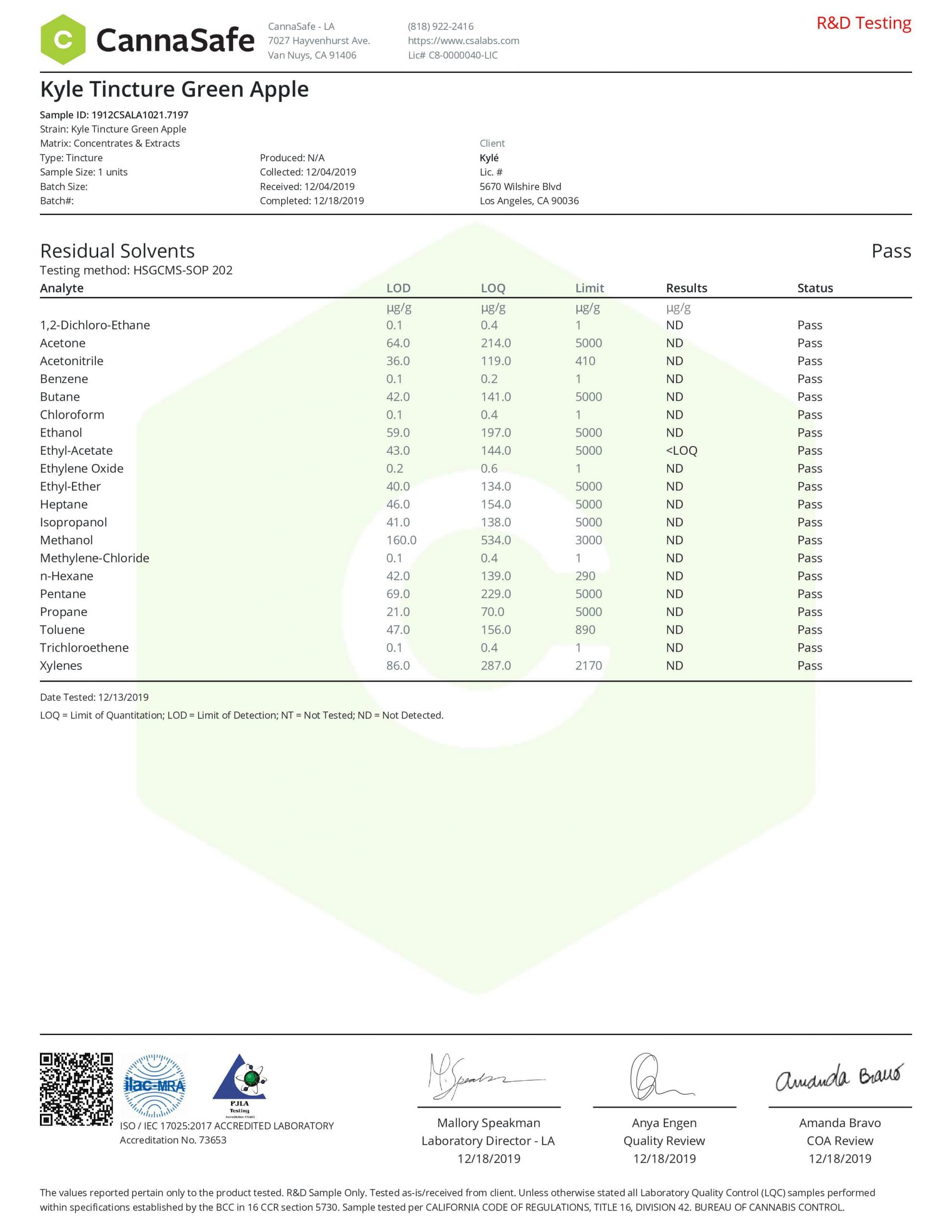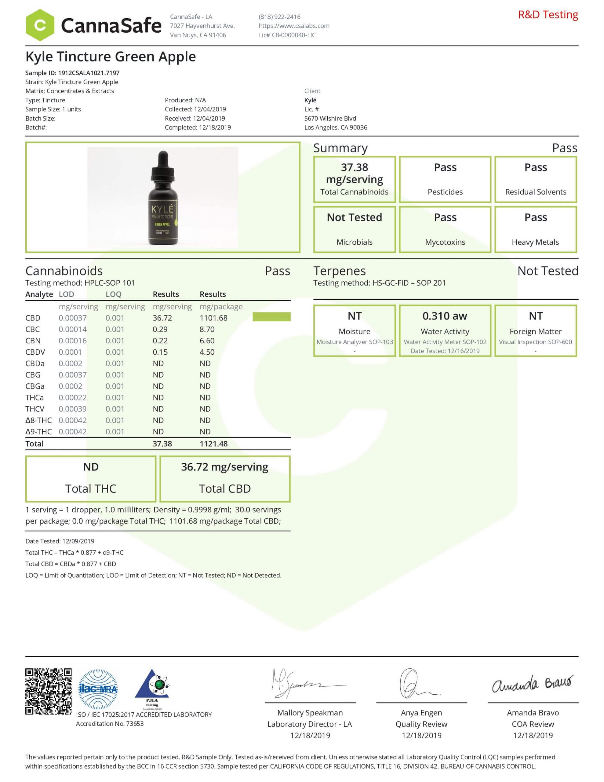 KYLE Gold Green Apple Drop CBD Tincture Oil Lab Reports test results with reference to CBD products.