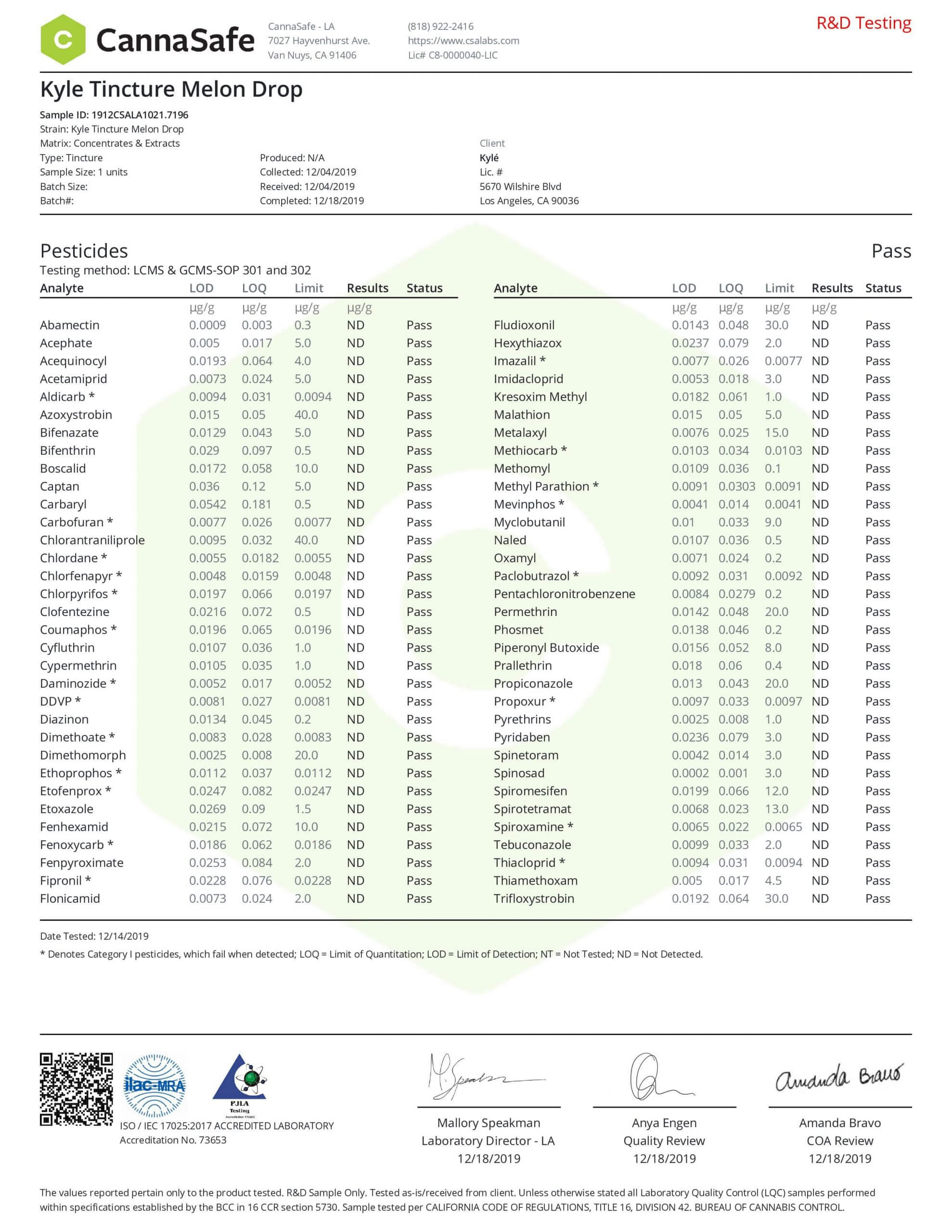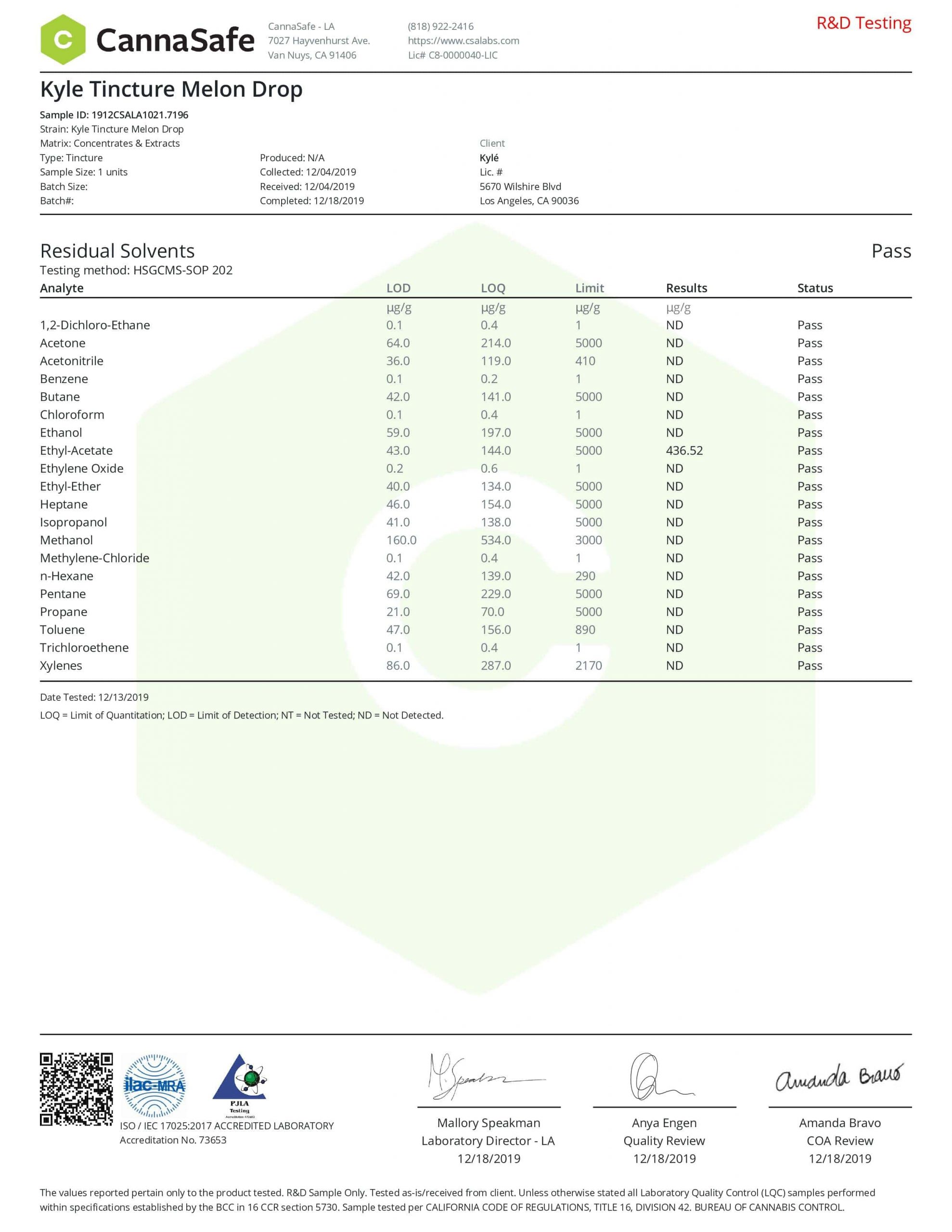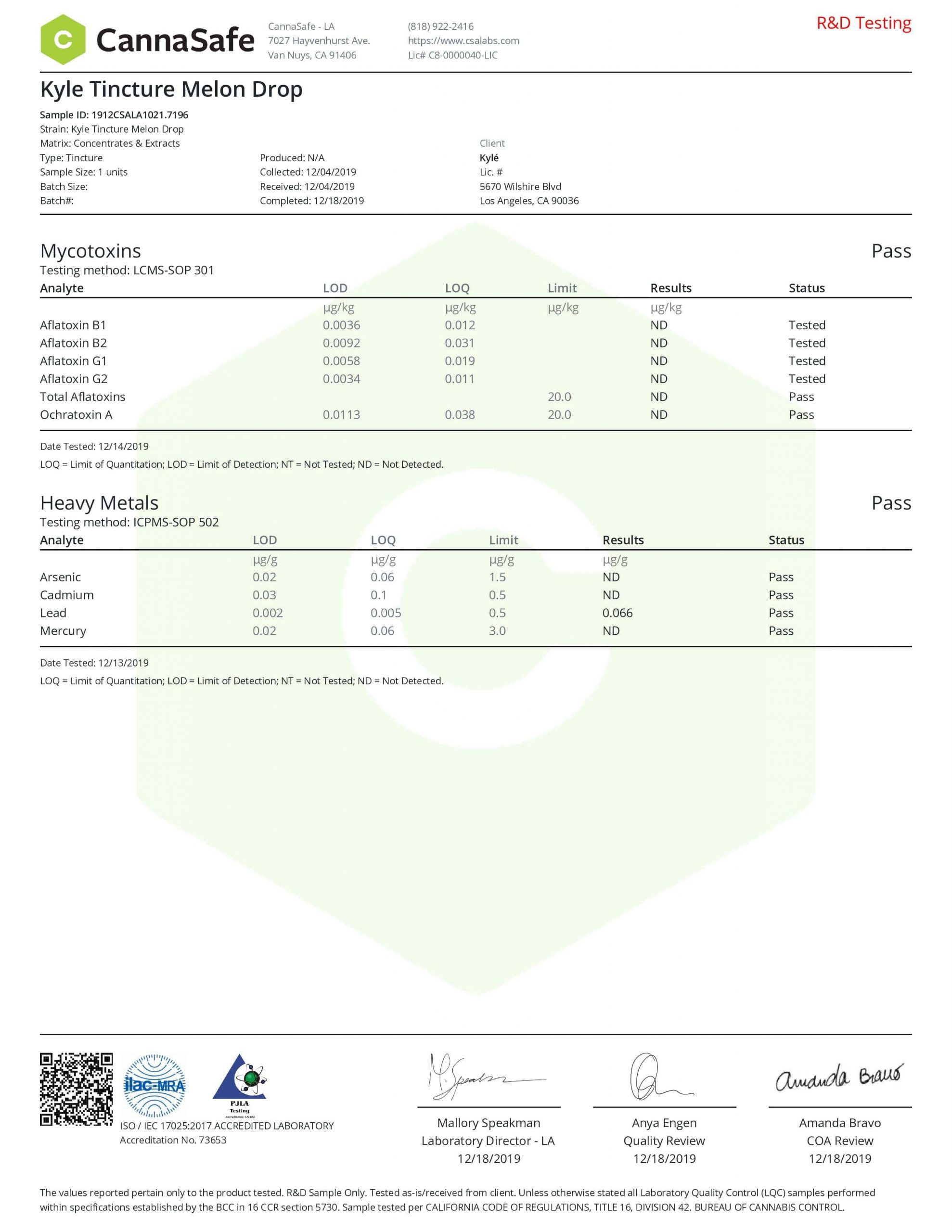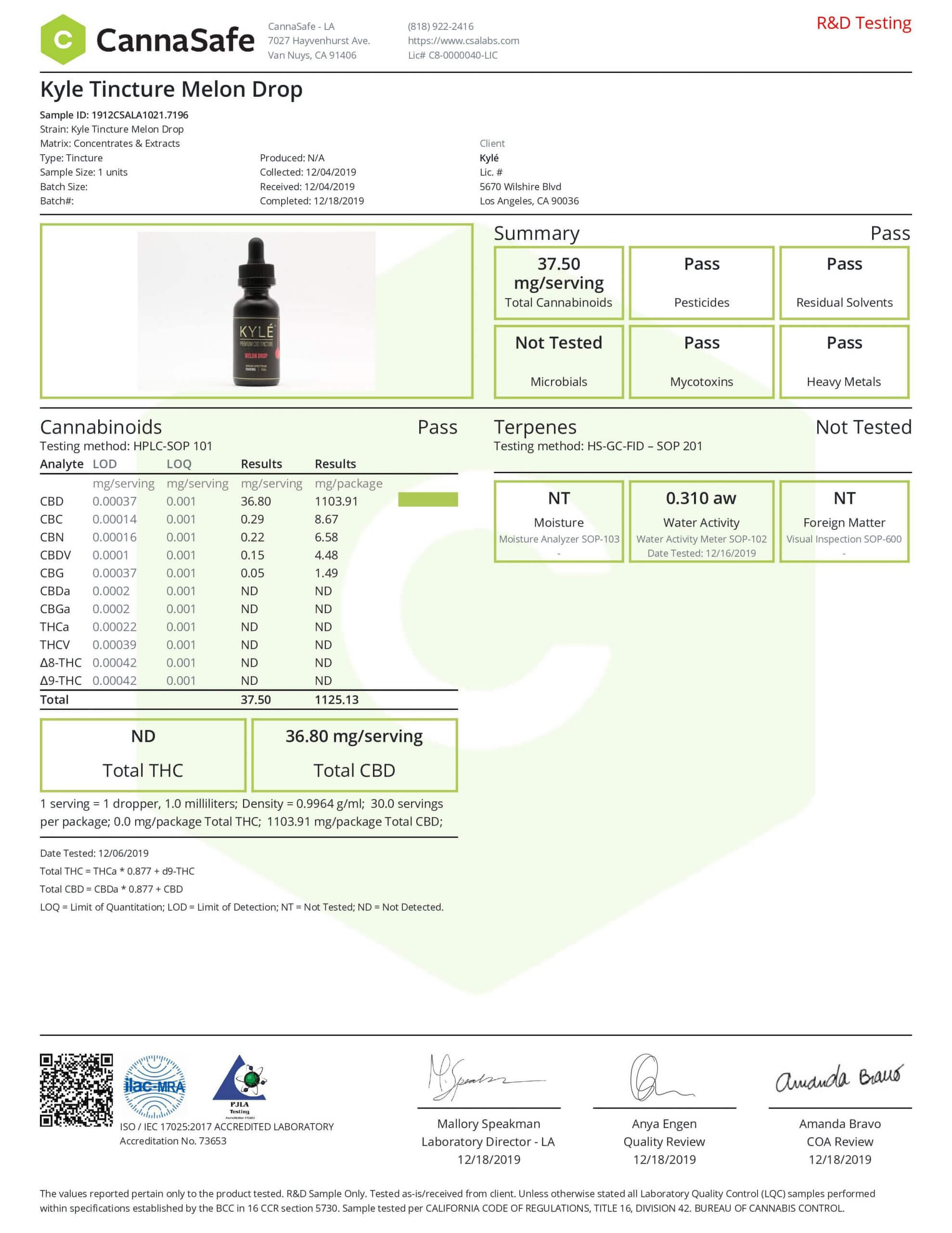 KYLE Gold Melon Drop CBD Tincture Oil Lab Reports test results with reference to CBD products.