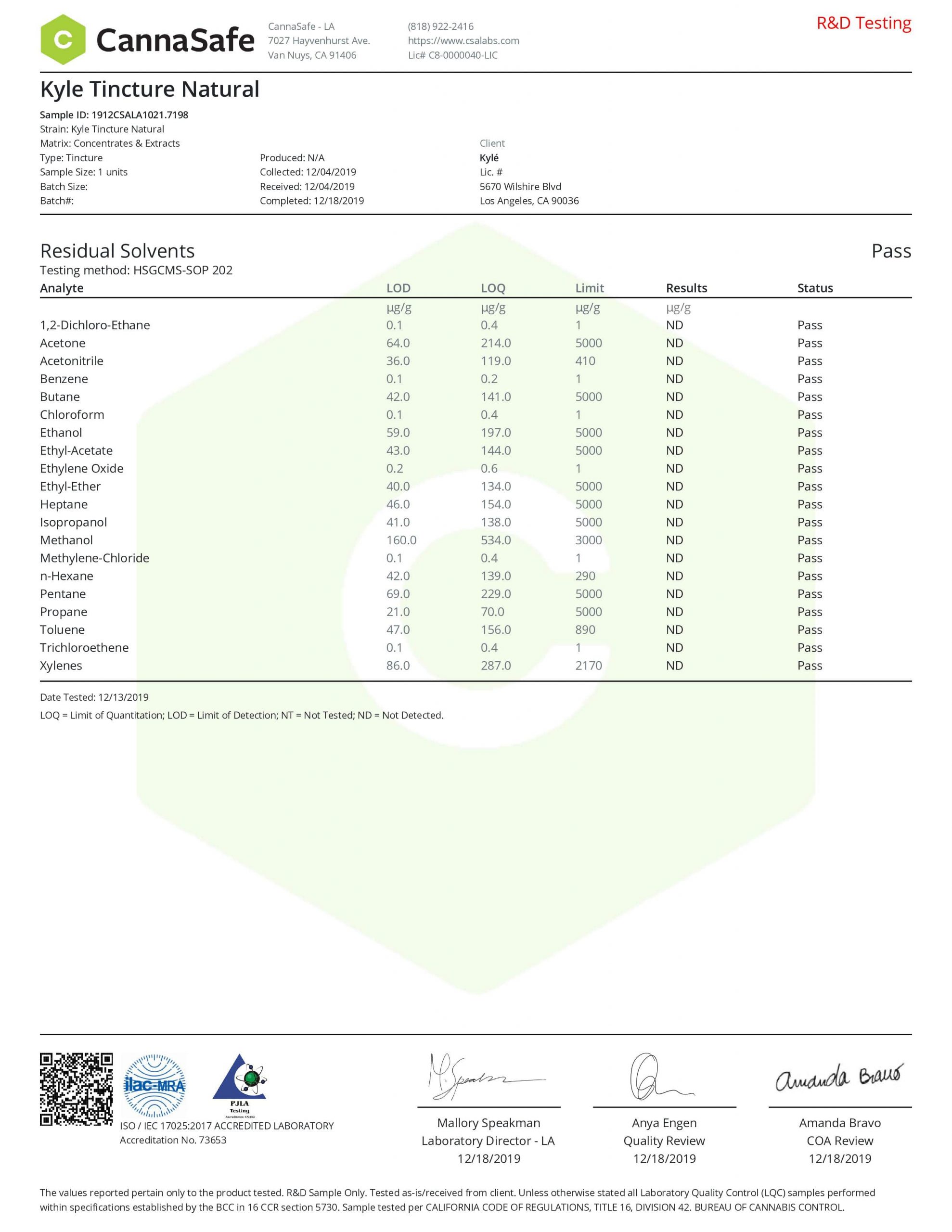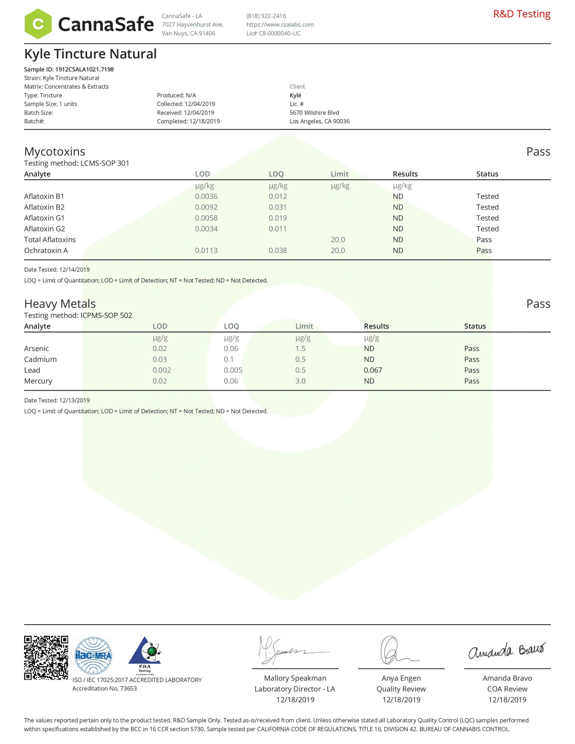 KYLE Gold Natural Drop CBD Tincture Oil Lab Reports test results with reference to CBD products.