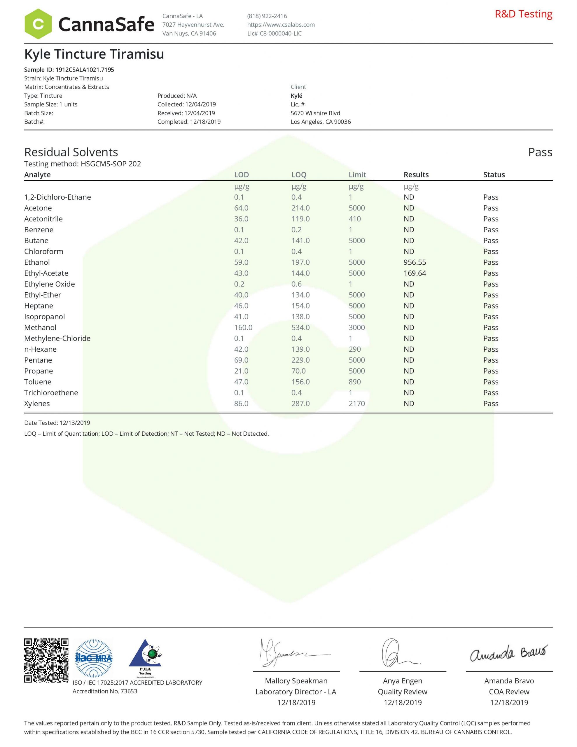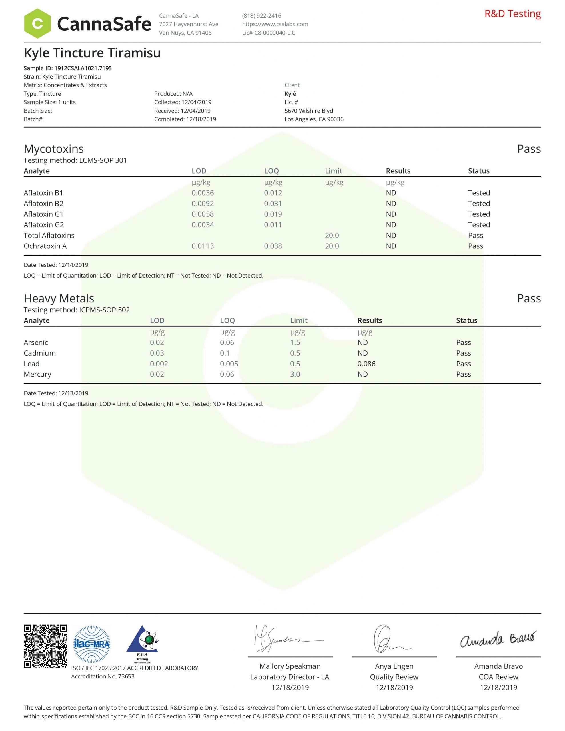 KYLE Gold Tiramisu Drop CBD Tincture Oil Lab Reports test results with reference to CBD products.