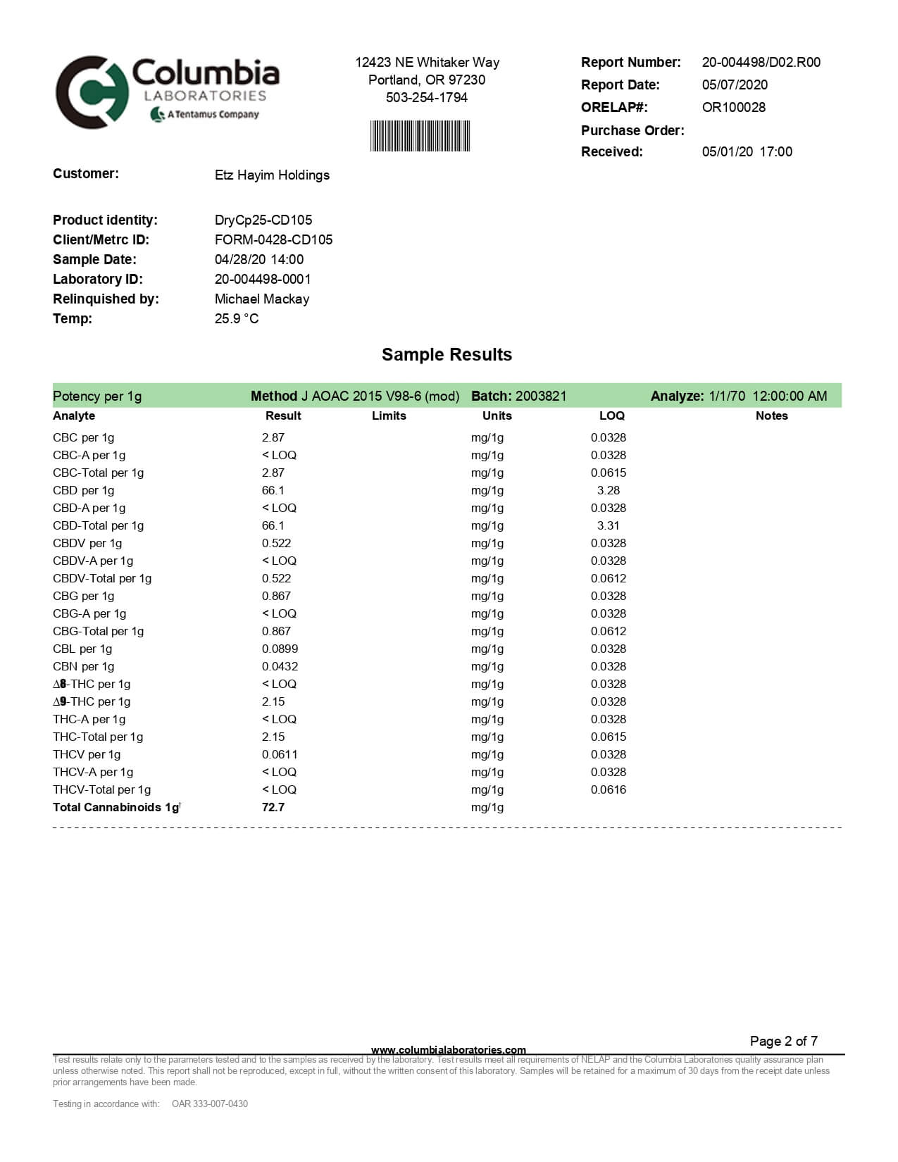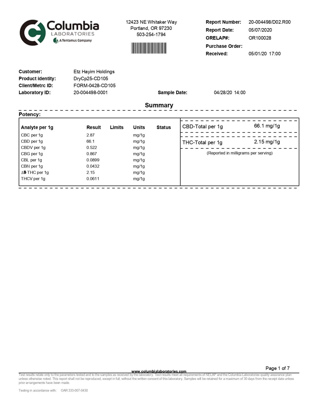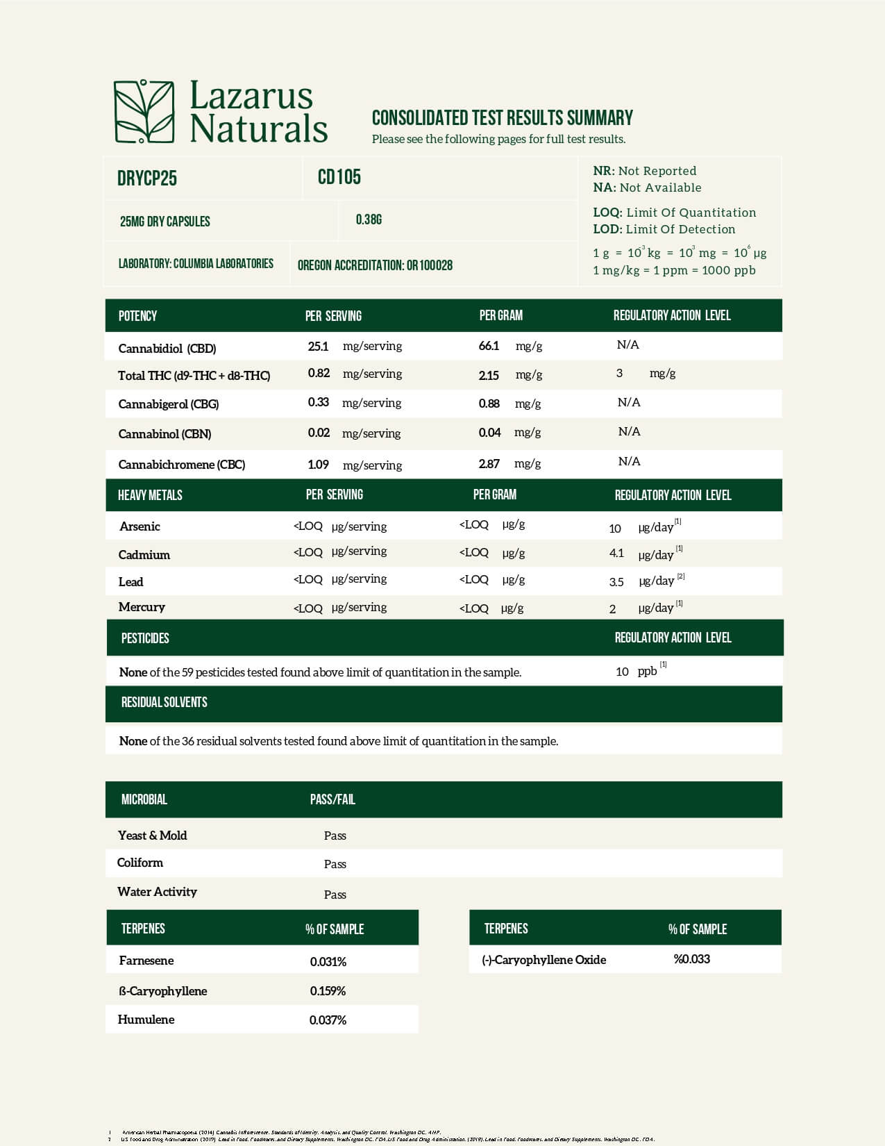 Lazarus Naturals Full Spectrum CBD Capsules 25mg Lab Report