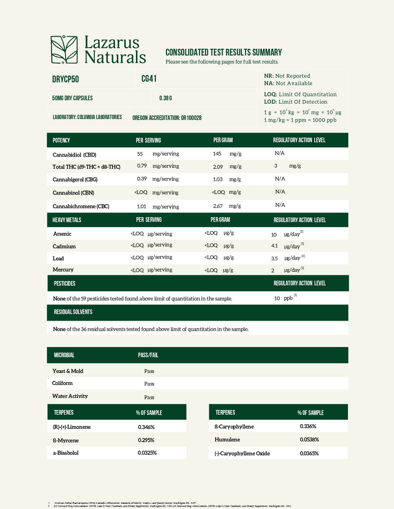 Lazarus Naturals Full Spectrum CBD Capsules 50mg Lab Report