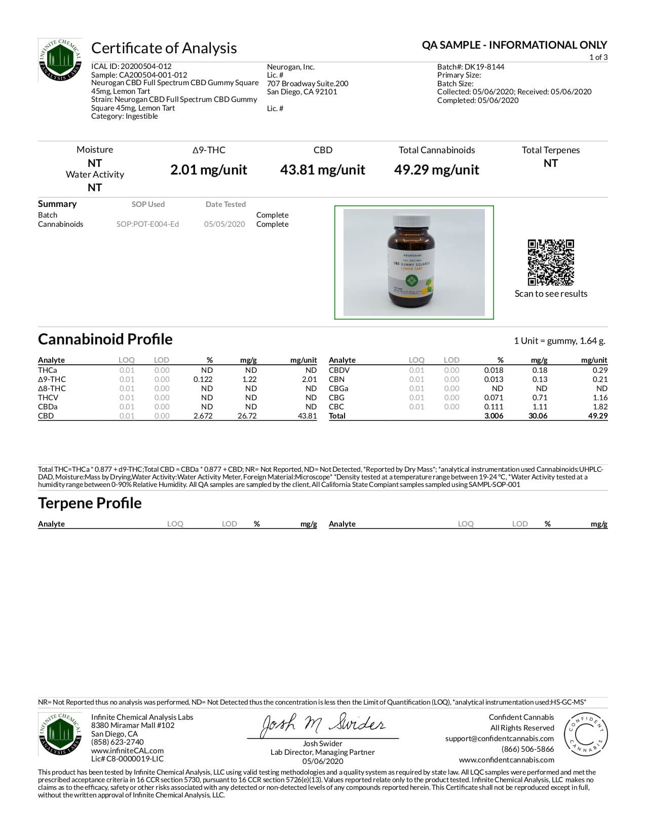 Neurogan, Inc. CBD Edible Full Spectrum Gummy Squares Lemon Tart Lab Report important details about vaping products.