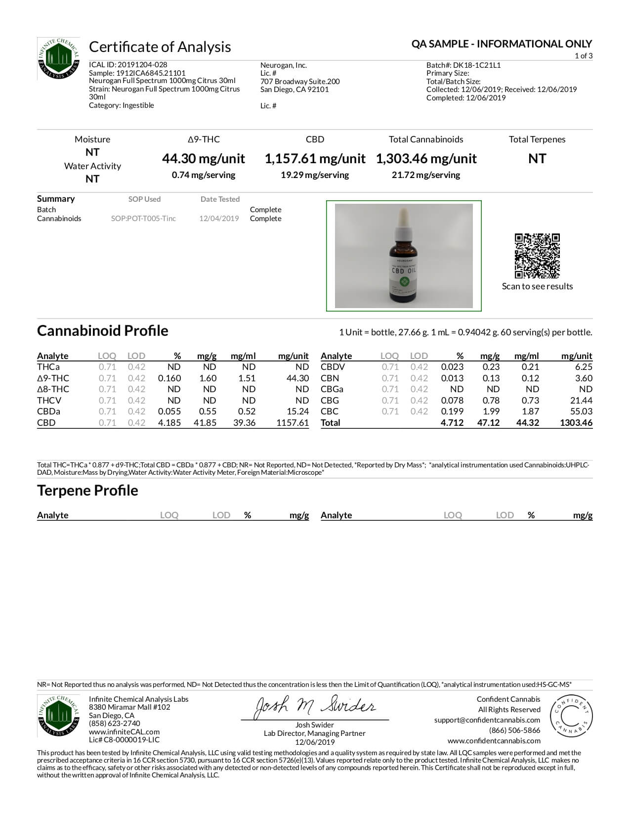 Neurogan, Inc. CBD Tincture Full Spectrum Citrus 1000mg Lab Report
